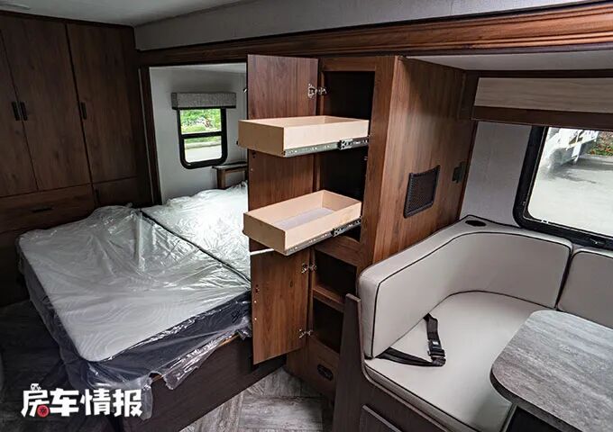 客厅和后方睡卧空间由大衣柜进行分隔,打开柜门里面还有多个储物抽屉。这辆车给大家配了两组大衣柜。车身尾部的大衣柜横向三开门,空间可是超级大了,就像把自家的大衣柜搬到车上一样。