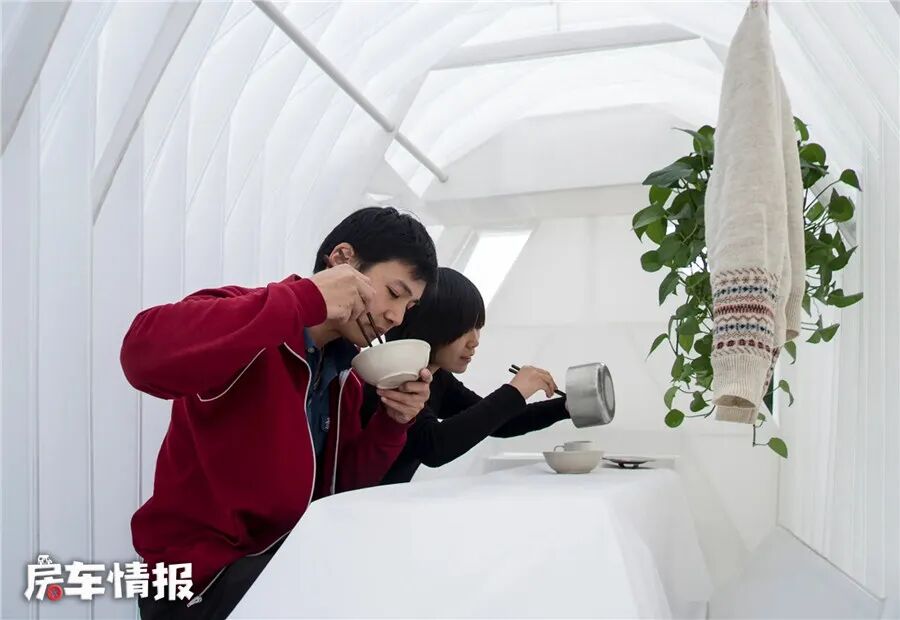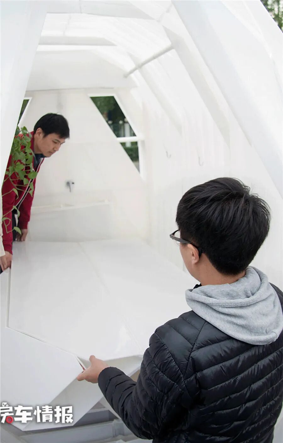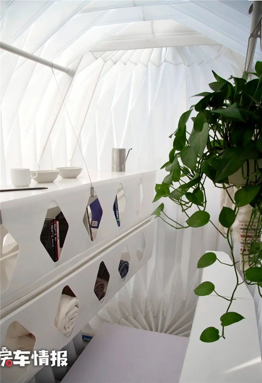 既然是绿色环保,所以这台车也是没有电力提供的,照明呢就要纯靠太阳自然光线喽,这也是我们选择聚丙烯建筑材料来制作这台车屋的另一重要原因之一,就是这种材料是半透明的,透光性极强。所以白天在车内,不需要任何照明,屋内也能非常光亮。