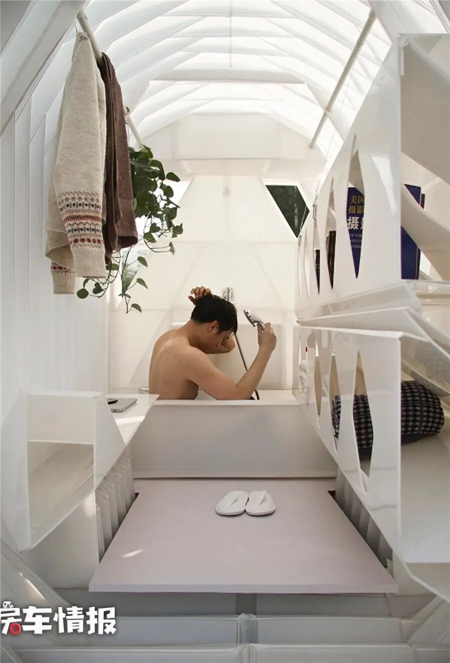 前方的墙壁上,可以看到一个水笼头,下方,两处聚丙烯折叠材质,上面这一处展开之后,里面左侧是电磁炉,右侧是水槽,在这里就可以简易烹饪一下快餐美食了。将我们的“小厨房”折叠依靠进墙壁,展开下方的聚丙烯折叠盒子,这里就是一个浴缸了,我们可以在这里洗澡,不过尺寸有点小,只可以容纳一个成年人坐在其中,并不可以躺下。且浴缸和水槽都通过上方墙壁上的同一个水龙头蓄水。