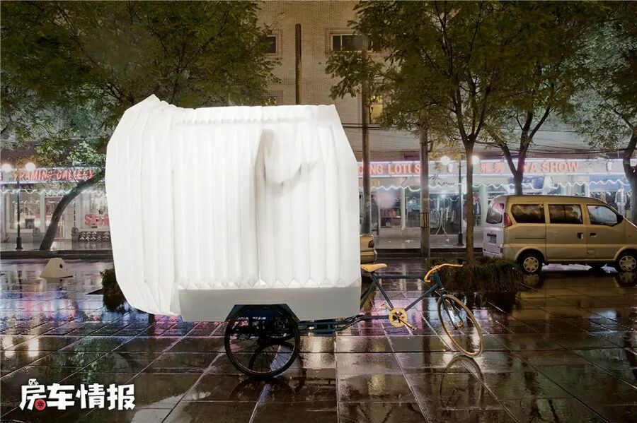说白了,它就是将一个车屋固定在三轮车上,这个车屋由聚丙烯(一种热塑性聚合物)制成。将聚丙烯折叠焊接成型,这种材质的好处是既能保持其强度,又能获得一定程度的灵活性。这使得这款三轮车屋才能像我们看到的这样,像手风琴一样被拉开。而且还可以与其他的三轮车屋相连接使用,以增大可用的生活空间。
