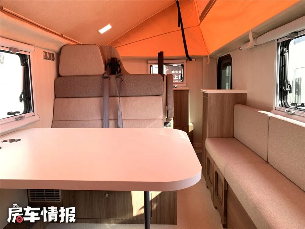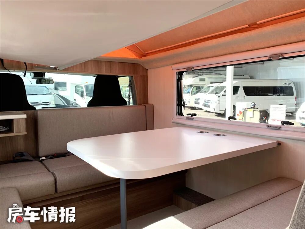 卡座沙发采用了棕色的设计,搭配白色的可拆卸餐桌,餐桌上配有两个水杯杯槽,方便我们放饮品,在行车的时候不会倾倒。夜晚的时候会客区域是可以拼床的,供两个人睡卧使用。车身左右和后面都配有外推窗,但是尺寸比较小,采光效果一般。