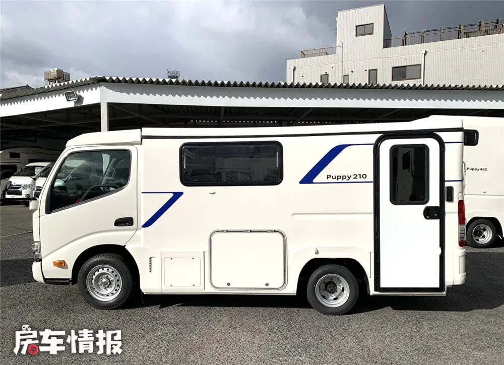 车身外部以白色为主色调,干净明亮,并搭配蓝色的拉花线条,整车采用后上门的布局。因为日本车都是右舵车,所以我们看到的日本房车乘客门一般都在车身左侧。