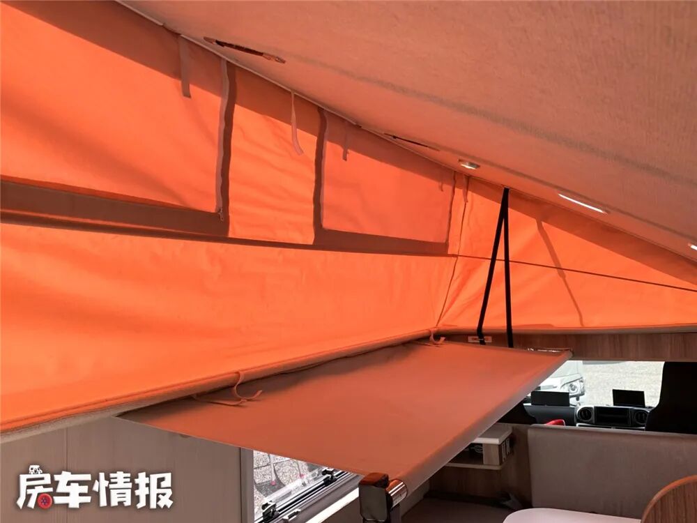 车身内部,感觉确实比较矮,我们需要把软升顶升起来, 否则无法在车内站直身体,这个软升顶采用的是倾斜式的打开方式。所以车身内部,左侧头部空间比较充裕,越往右侧越矮。