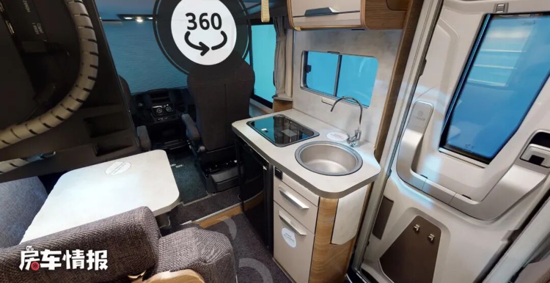 厨房区域操作台面积不算大,但是够用,开放式洗菜盆,上下足够的储物空间,值得一提的是,不同于咱们常见的车内安置的电磁炉,这款车的操作台上黑色面板掀起来之后是燃气炉灶,可以车内炒菜做饭。操作台旁边还有一块翻折拓展板,拓展板掀起来之后也不会影响车门处进出,属于很人性化的设计了。操作台下方,嵌入式95升冰箱,空间利用率真的很不错。