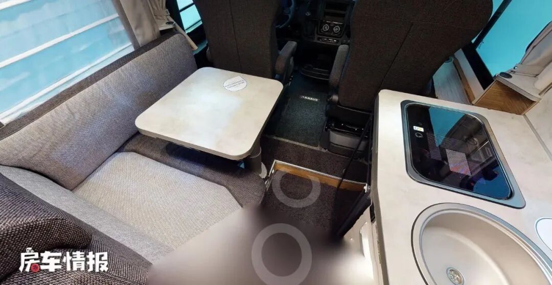 沙发休息区是L形卡座设计,主副驾座椅可以360度旋转,和卡座沙发形成一个可供5人休息的区域。小桌板可以前后左右的调节角度哦,不用担心你会离餐桌太远。