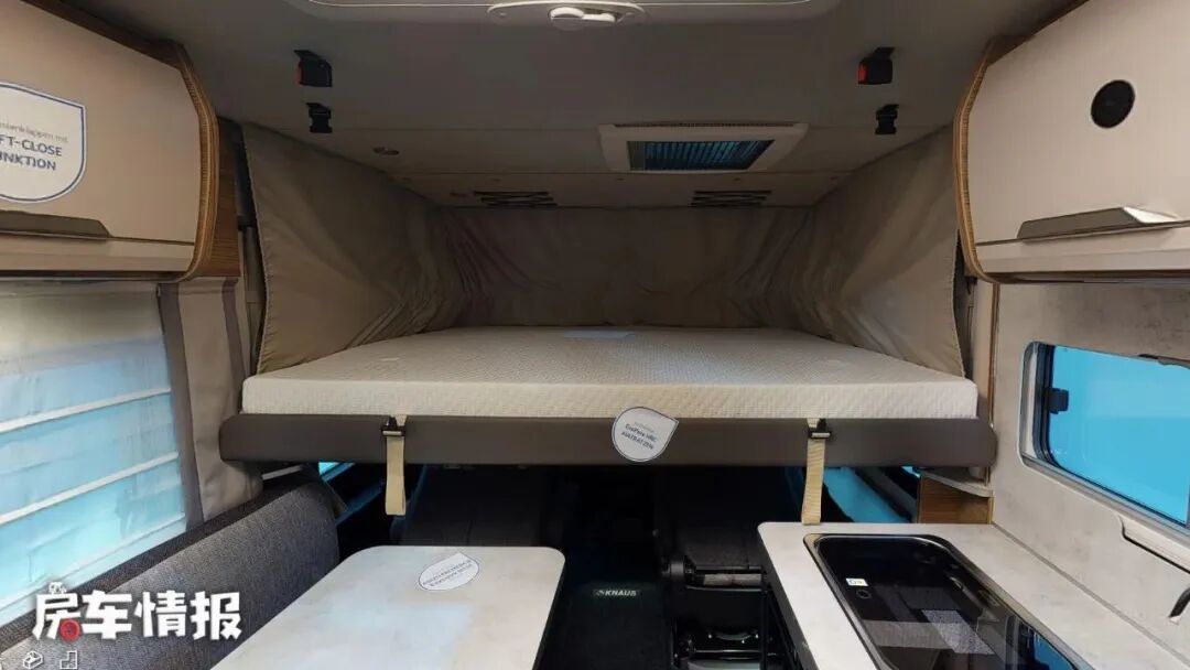 除了这张法式床,这台车还有一张床,它藏在哪了呢?就在驾驶式上方,做了一个升降的设计。手动下拉式,主副驾座椅靠背翻折后,就可以把床拉下来啦,尺寸也不小哦,1850*1500mm,两个人睡没问题,并且高度可观,可以直起身子坐着。
