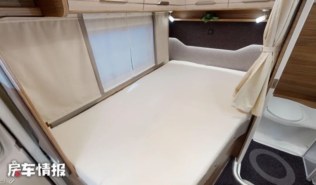 后置竖床,采用的是一个法式床的设计,舒适感比较好,尺寸是2010&1400mm,可同时供两个成年人休息。而且床边的外推窗很大,睡在这儿总有一种在自家卧室的感觉。床上方一排储物柜,储物空间非常充足。