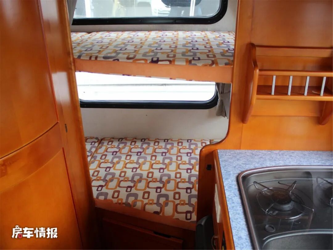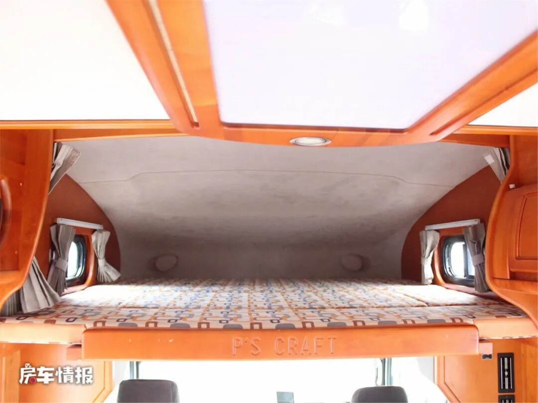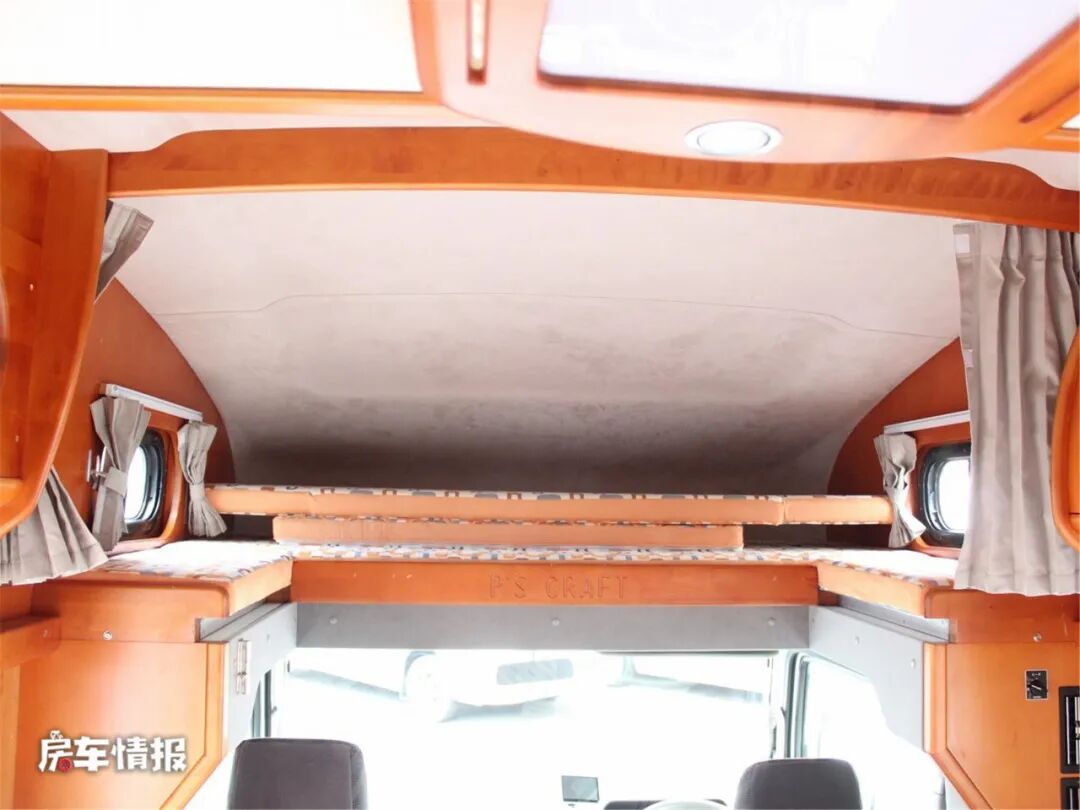 一进车门左边就是驾驶室,上方的大额头给车内提供了一个实用的额头双人床空间。两侧带有通风窗,床边和窗户上都配有隐私帘,提供一个安逸的睡眠空间。与国内的大部分翻折式额头床设计不同,这个额头床板两侧带有导轨,是推拉式设计,可以很好的收纳回去。