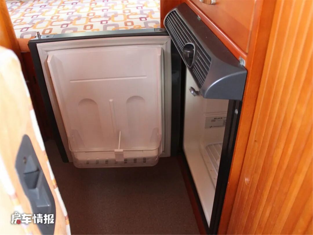 再往里,就是厨房灶台,玻璃盖板下面是双眼燃气灶,旁边是水槽+隐藏式水龙头,这样的设计就能使得灶台摇身一变,当成置物桌使用。下方的橱柜和抽屉增加了储物空间,还安装了一台50L的冰箱,采用DC直流12V供电,实用、小巧。