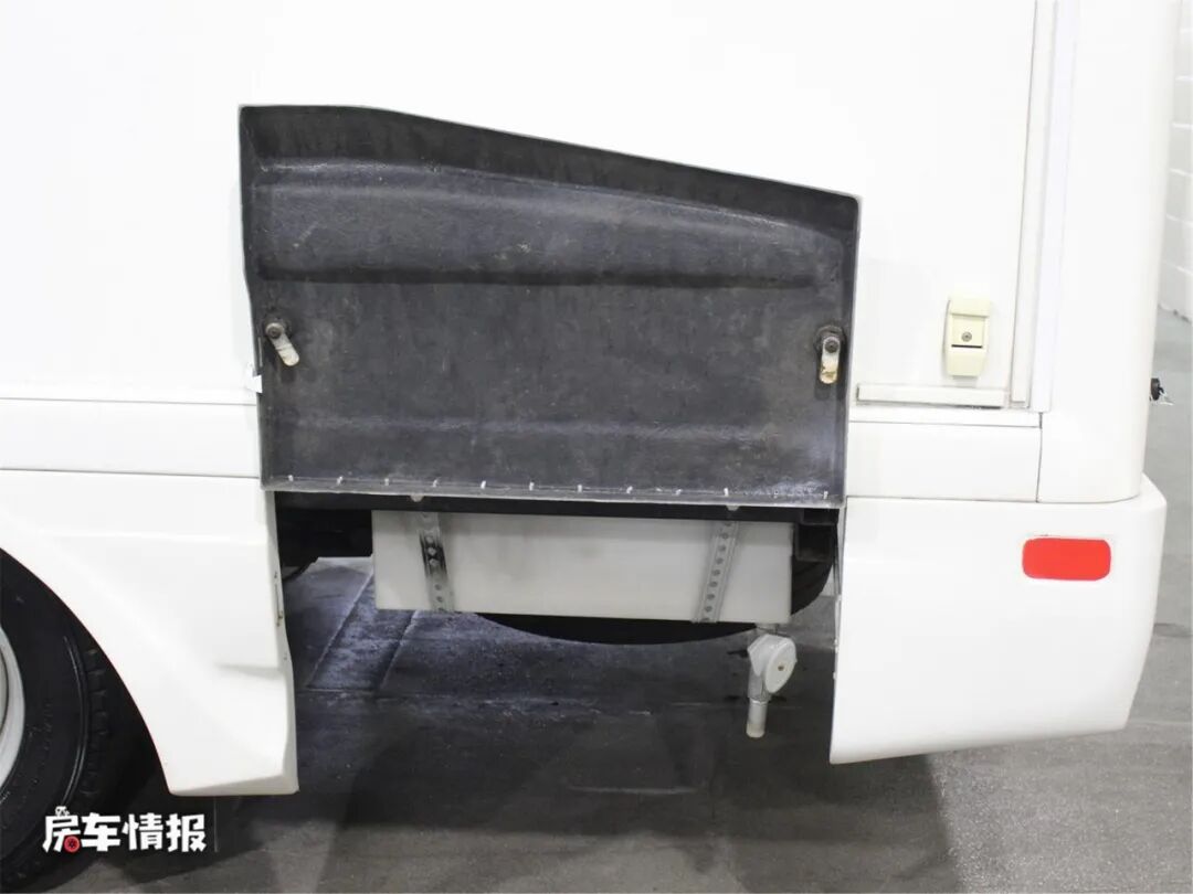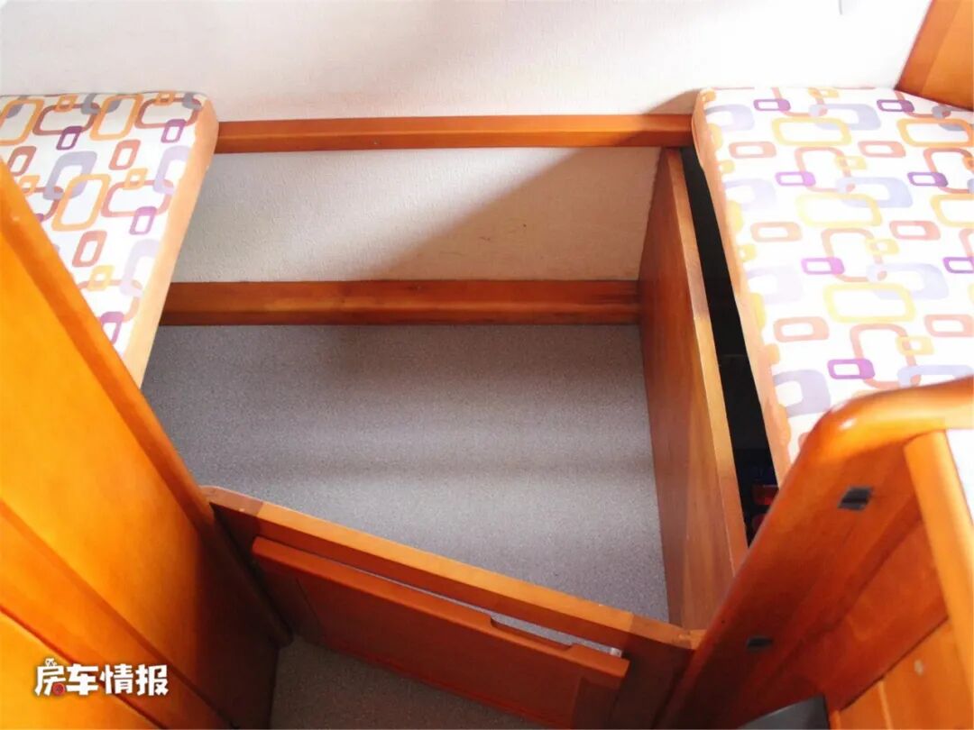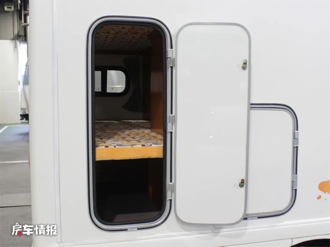 上铺和下铺都有独立的窗户,无论是采光还是通风效果,都非常适宜。一层床铺下方的储物空间不仅大,还是与车外储物舱互通的设计,取放行李物品更加方便、自如。车外舱门开的非常高大,目测舱门甚至可以供人进出床内外,估计紧急情况下,这简直就是”EMERGENCY EXIT”呀!