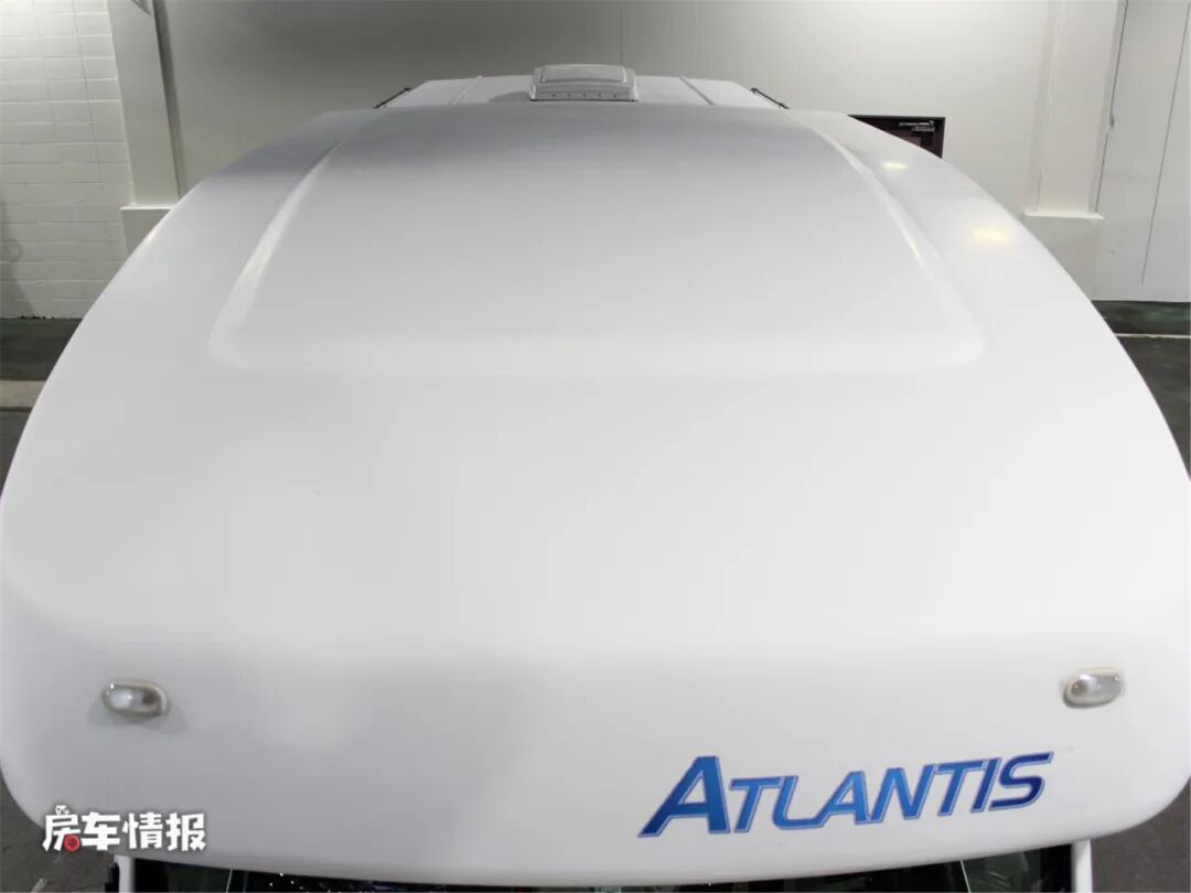 车身整体灰白底色,除了“ATLANTIS”的logo和字符没有额外的线条,显得整洁、低调。侧面是一大一小两个储物舱,方便存放行李、物品。舱门旁边设置了超大的推拉窗,行驶过程可以适当开启,通风换气。