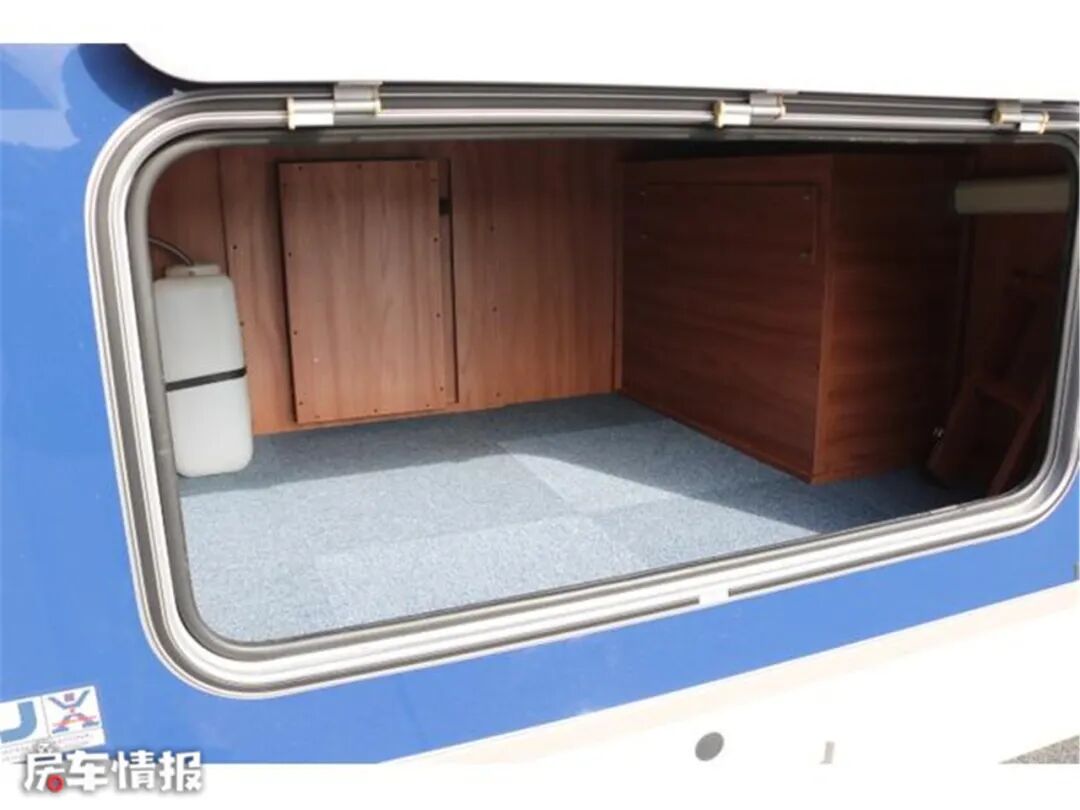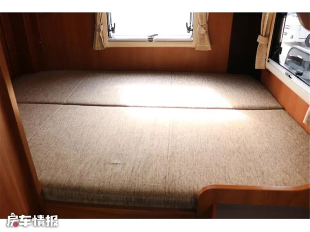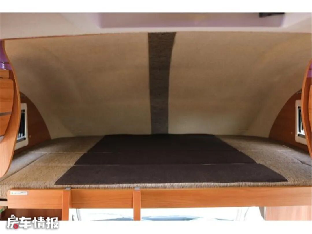 车尾的休息区由一张固定的双人床组成,中间的床垫是可以折叠的,方便利用床下行李空间。床底下的储物仓与车外储物仓仅仅隔了一道门,方便车上、车下取放行李物品。