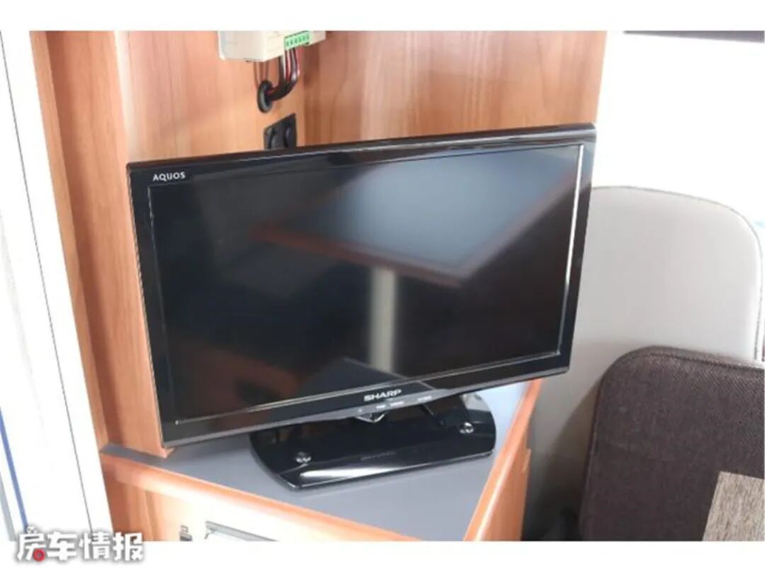 鞋柜和厨房灶台分别位于乘客门两侧,一些常用的电器开关按钮和水、电显示器等等都在柜子面板上,方便操作。上方还放置了一台24寸直流液晶电视,可以随时调整角度,以供不同位置家人来观看电视节目。