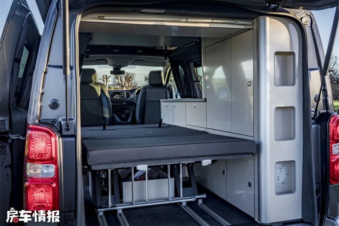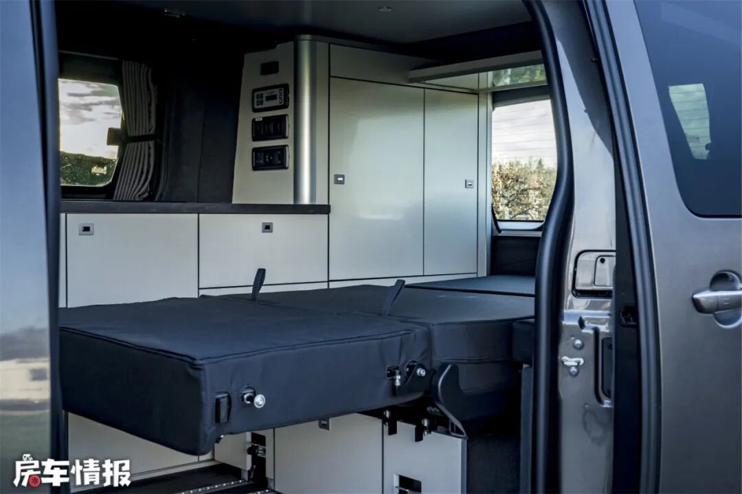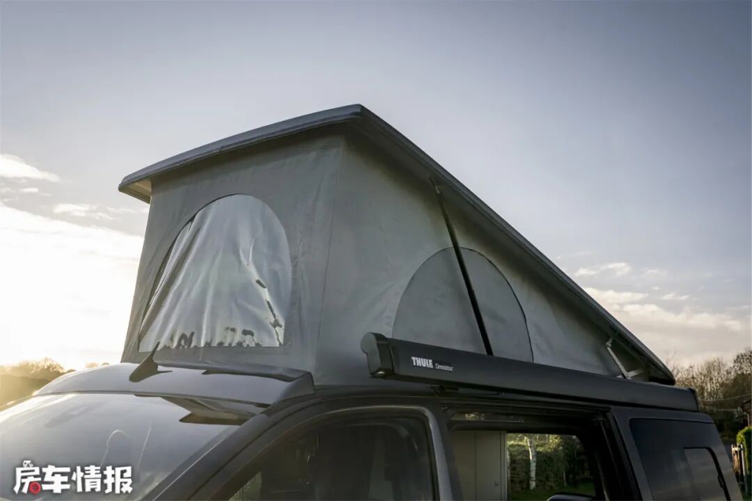弹出式车顶的设计,为车能增加了不少空间,不仅是车身高度的增加,配合车顶帐篷,形成了第二个休息空间,这个双人大床,既可以供两名成年人睡眠,又能坐在上面看星星,小孩子的最爱。