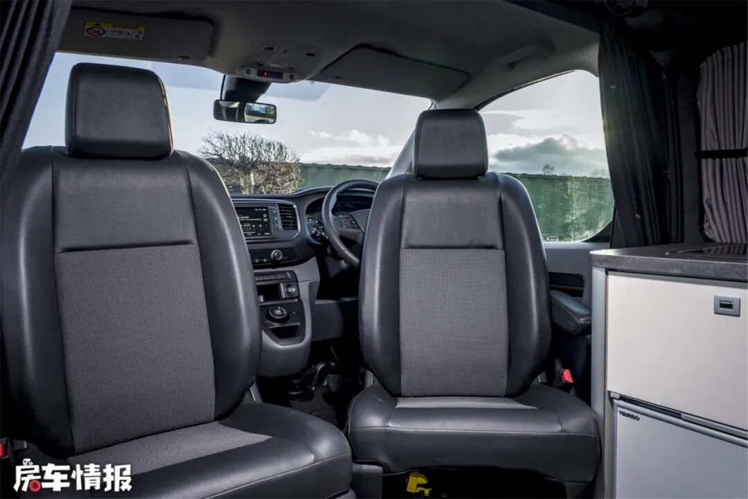 进到房车内部,会客区由双人座椅+移动茶桌组成,驻车露营时,可以将移动桌椅搬出车外遮阳棚下使用,非常方便。前面的主副驾驶座椅,都可以180°旋转到后面,和后排座椅形成四人对坐卡座,商务感很强。