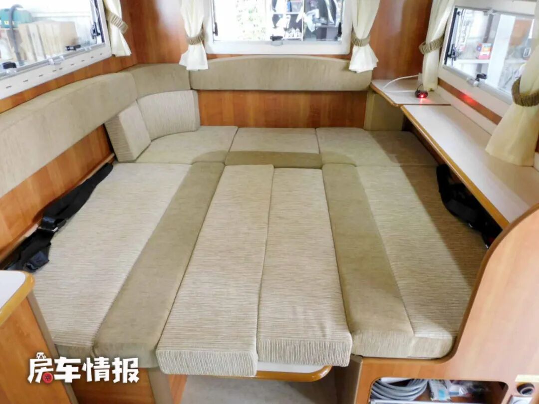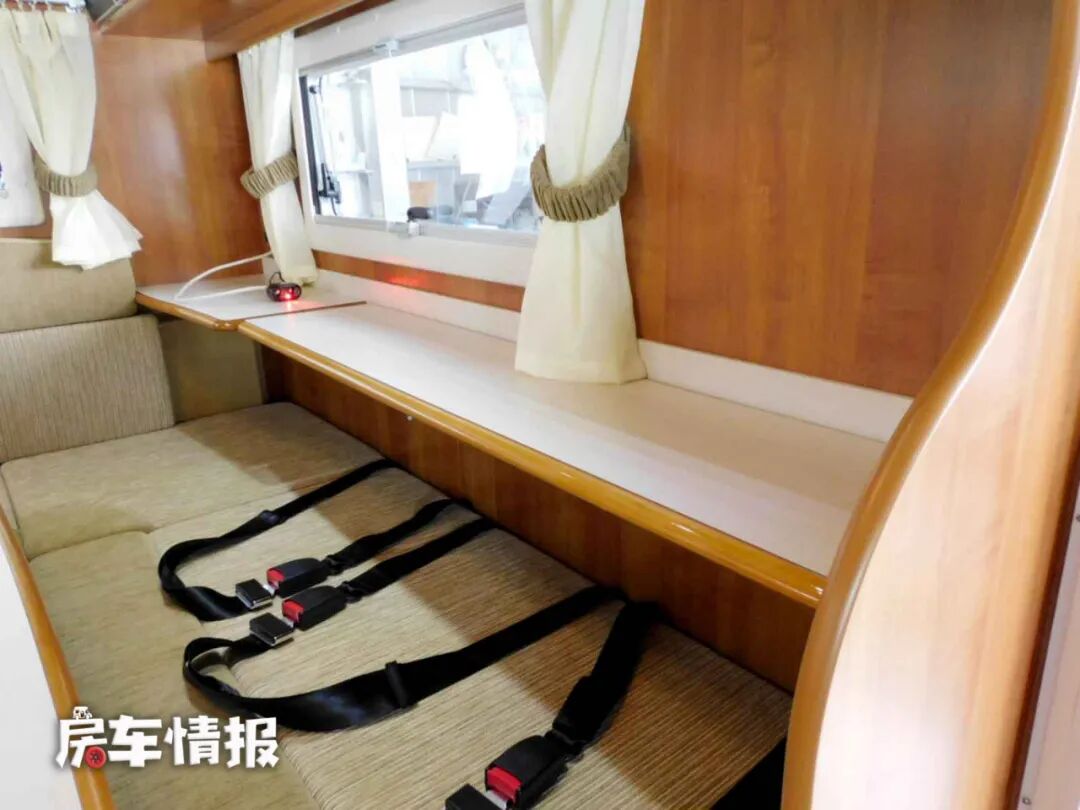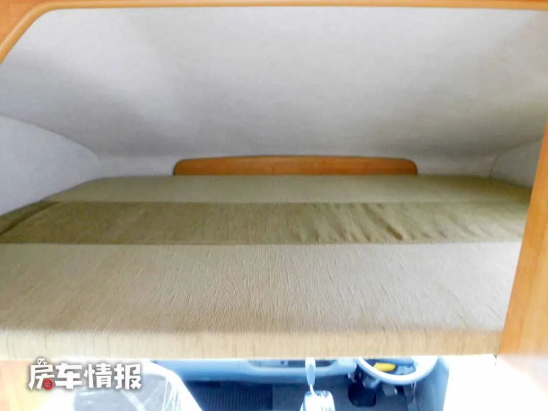 在驾驶室顶部依然是一张额头床,不过受限于车顶部低矮的造型设计,额头床内侧的高度稍微有些压抑,睡下2名成年人稍微有些拥挤,不过睡下2名小朋友还是没有问题的。