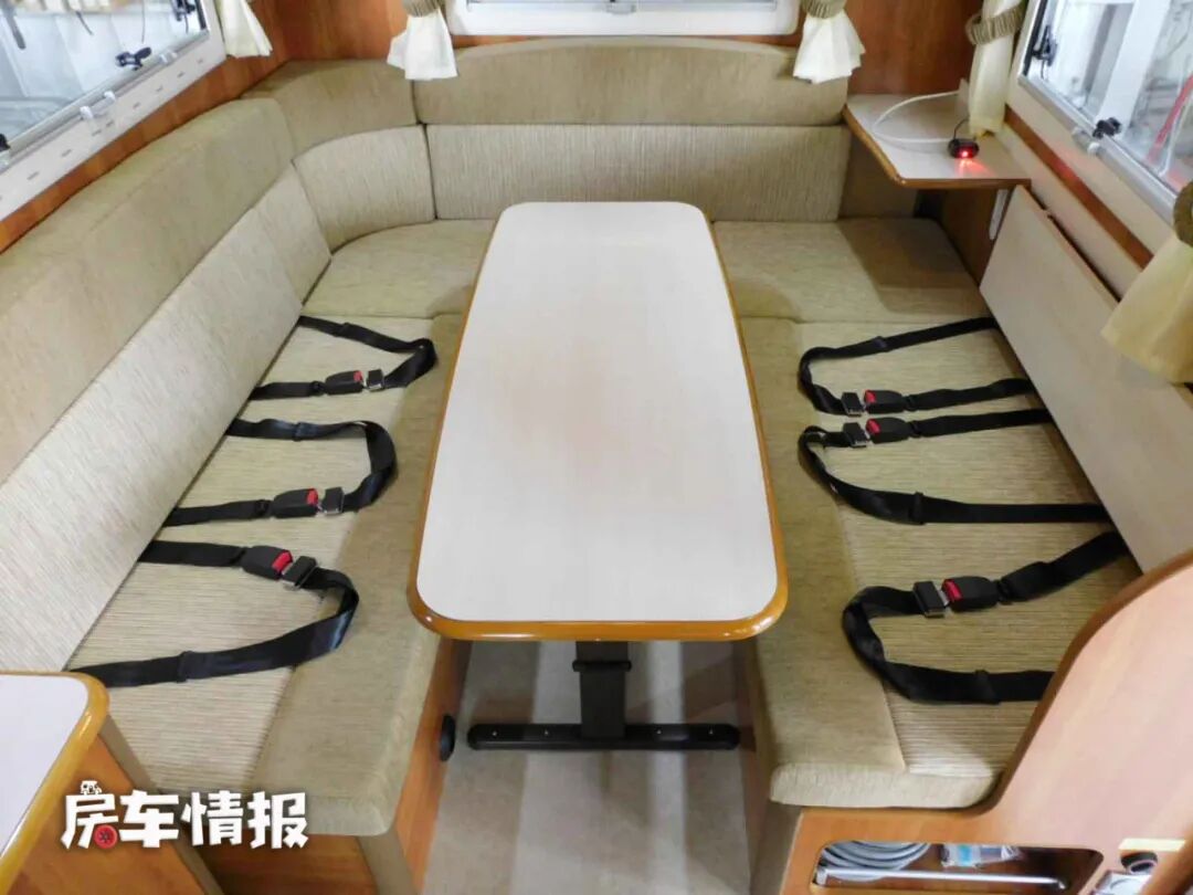 来到车厢尾部就是车内的会客休息区了,一张尺寸超级大的U型沙发,可以同时满足6人在这里乘坐,并且6个座位均提供有安全带,保证了日常行驶中乘坐的安全性。