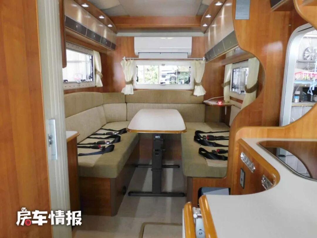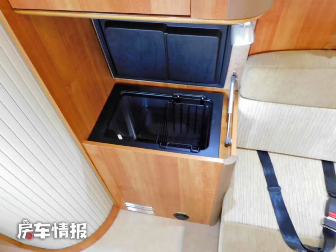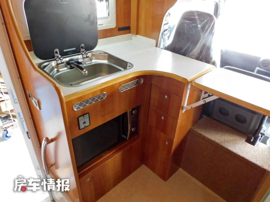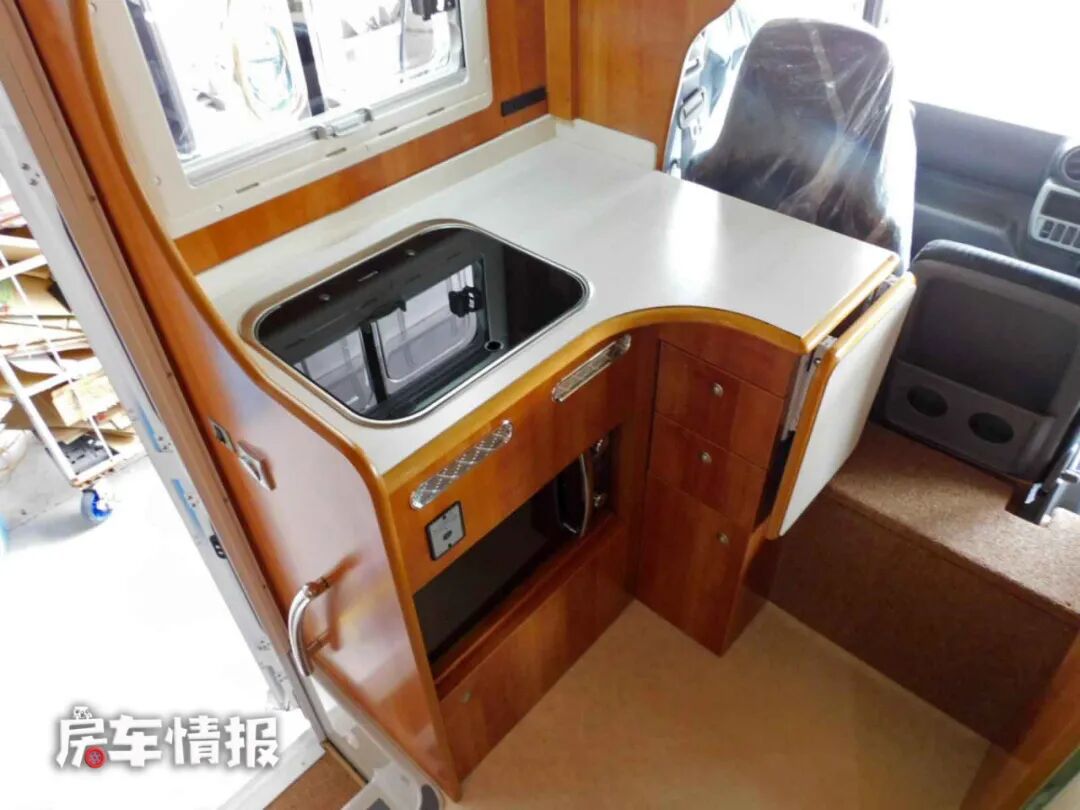 进入车厢内部,车内采用了比较少见的布局方式,车厢前部并不是常见的卡坐沙发区域,而是一个厨房区域,在这里提供了洗菜池、微波炉、冰箱以及一个可以翻折的操作台,整个厨房区域的空间还是非常大的,日常使用比较得心应手。