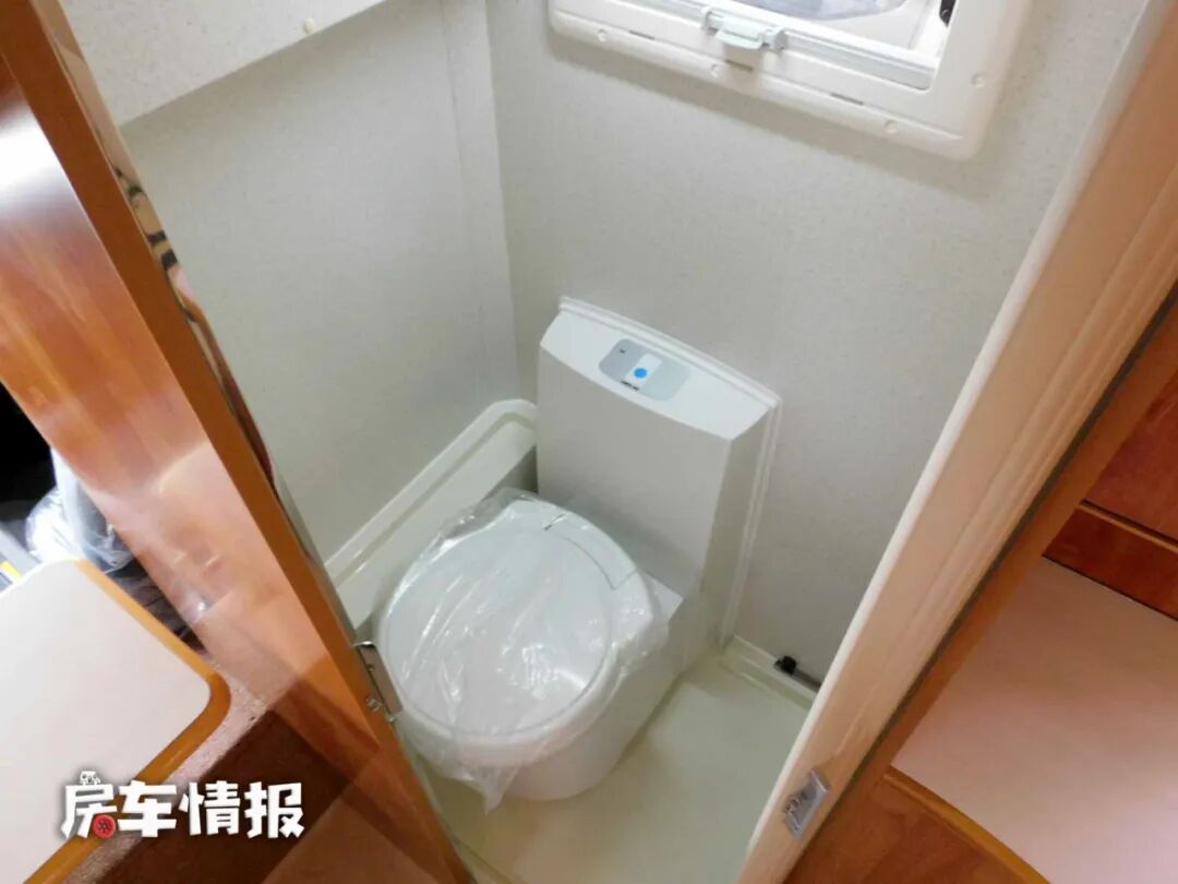 另外值得一体是,车内的卫生间也被设置在了车厢的前方,采用的是推拉门的设计,空间灵活性更好。令人感到意外的是,卫生间里居然提供了盒式马桶,这在日本房车里真心挺少见的。