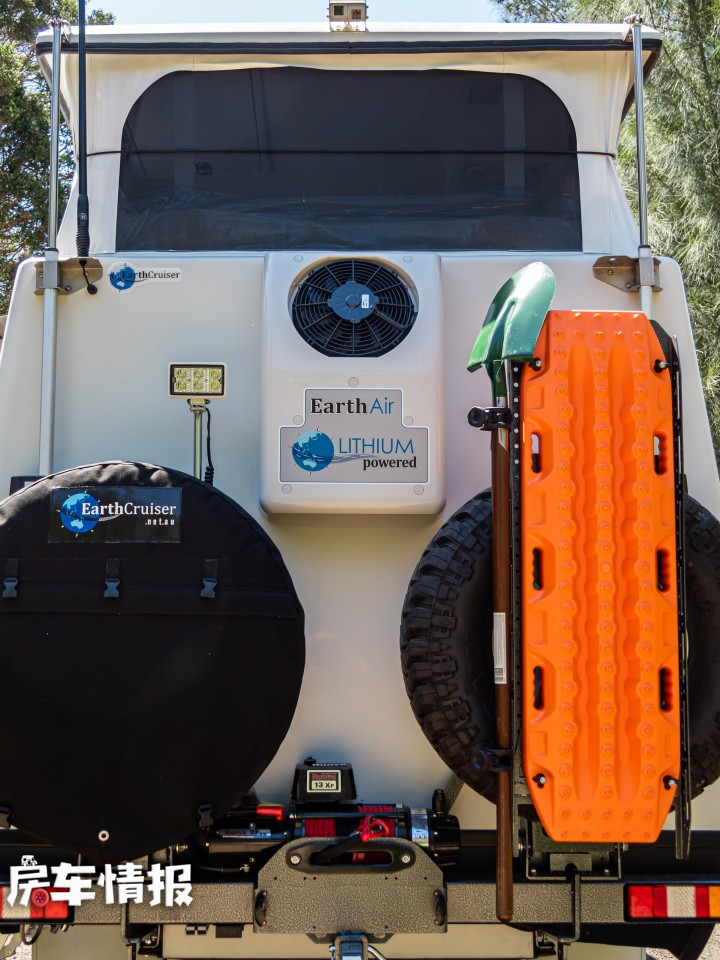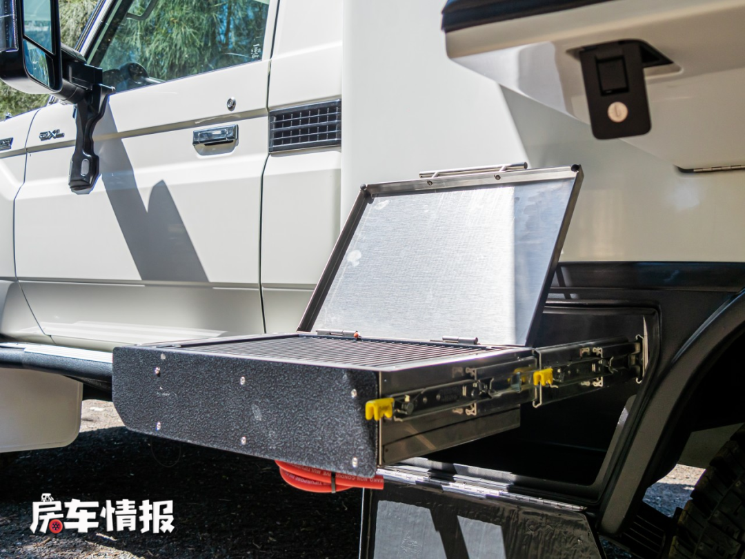来到车身尾部,同样提供了丰富的户外救援设备,脱困板、铁锹、双备胎、绞盘等等一应俱全,不仅可以救助自己,同时也可帮助其它伙伴脱困。车外还提供了一个外置电烧烤架,方便在车外烤肉!
