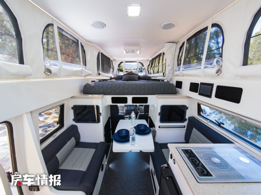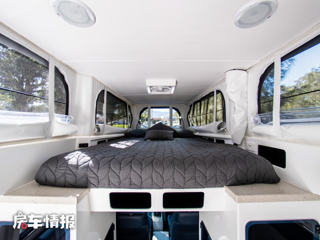进入车厢内部,内部的整体布局和常见的皮卡房车相似,但得益于更大的车身,内部空间也更加宽敞,驾驶室顶部是一张尺寸约为2000*1400mm的双人床,基本上睡下2大1小3口人是完全没有问题的。