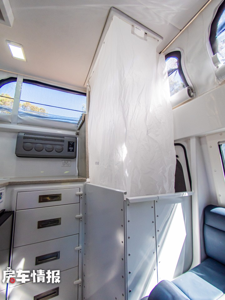 车内的卫生间采用的是一个隐藏式设计,需要淋浴或者如厕的时候,可以把位于车顶部的浴帘打开,同时把隐藏在墙体底部的围挡打开,这样车内就形成了一个简易的卫生间,搭配车上80L净水箱(最多250L)可以满足家人简单洗漱。