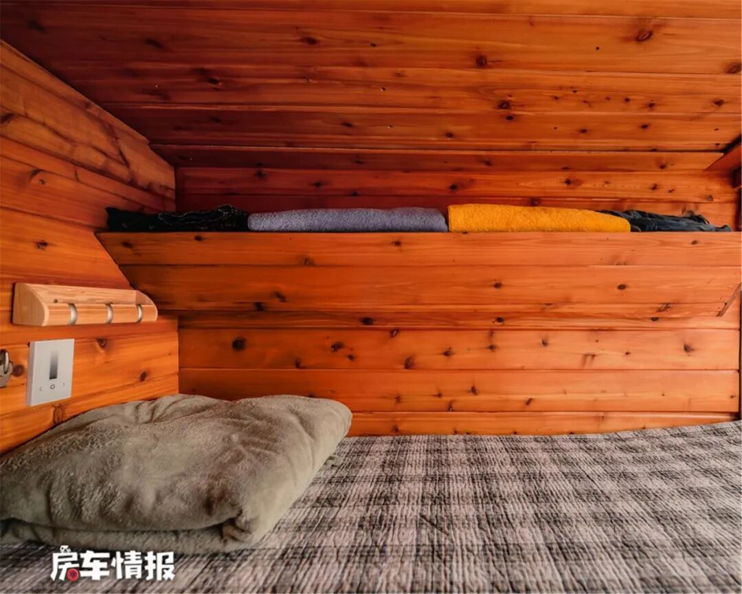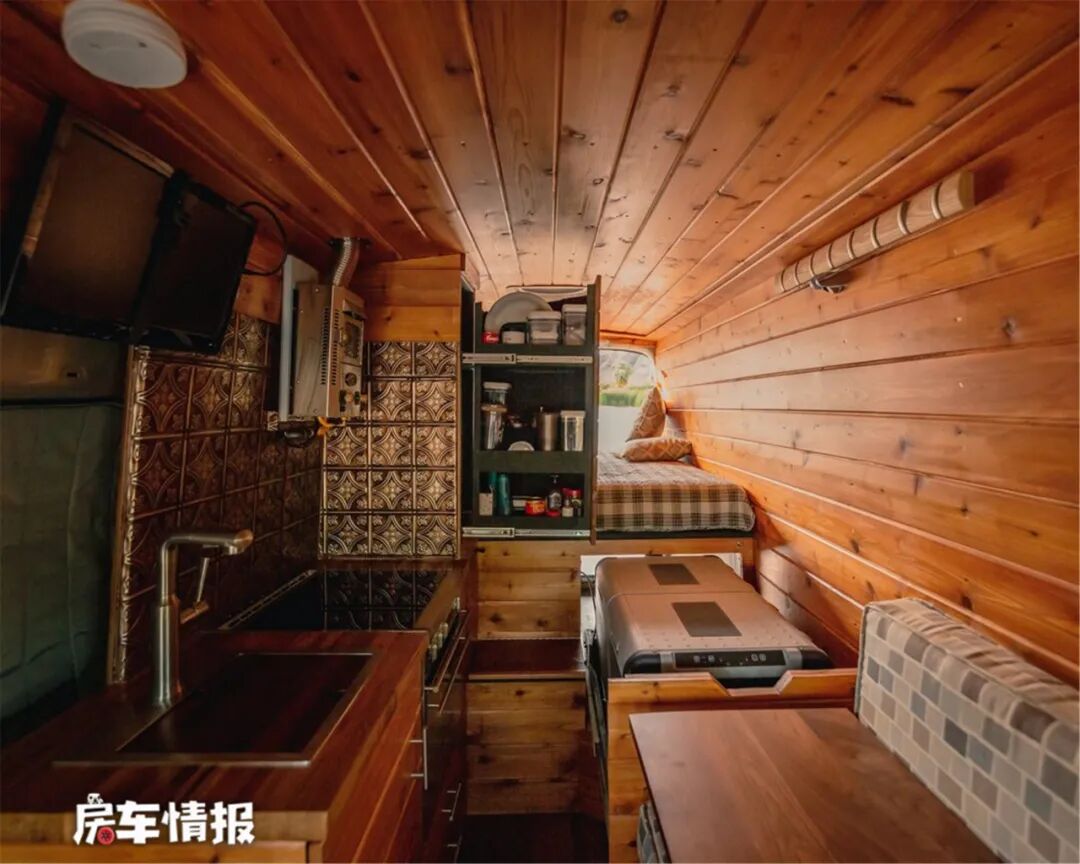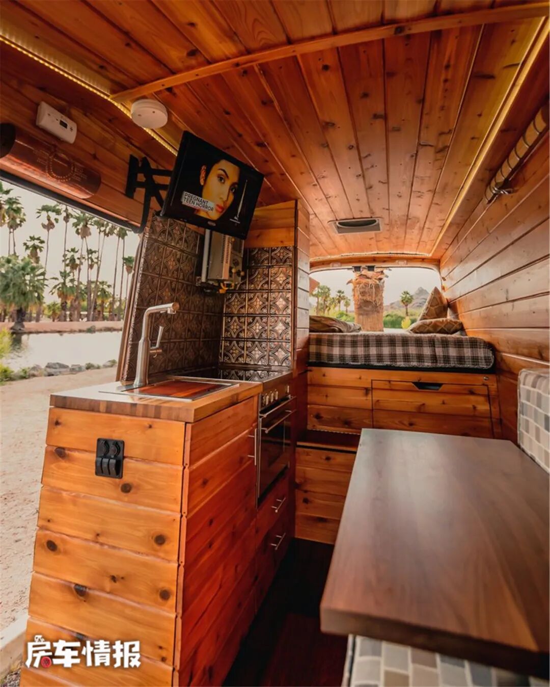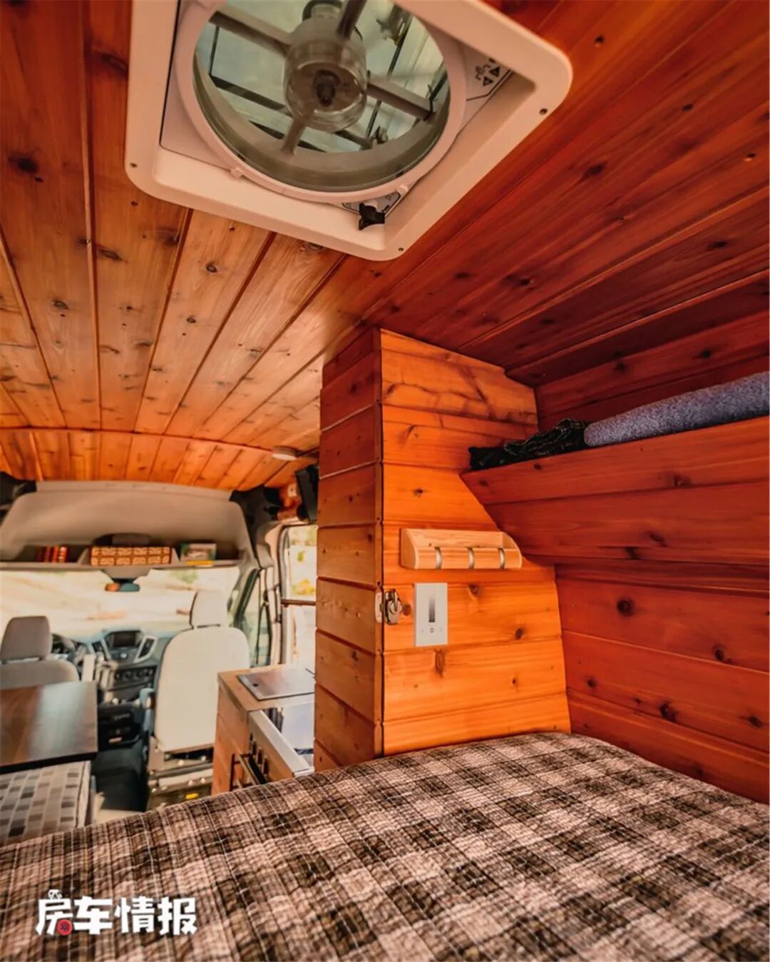 房车采用中置滑动乘客门,进门仿佛进入一所豪华的木屋别墅。整个室内由红色雪松构成,深色竹地板,如火如荼,十分壮观。