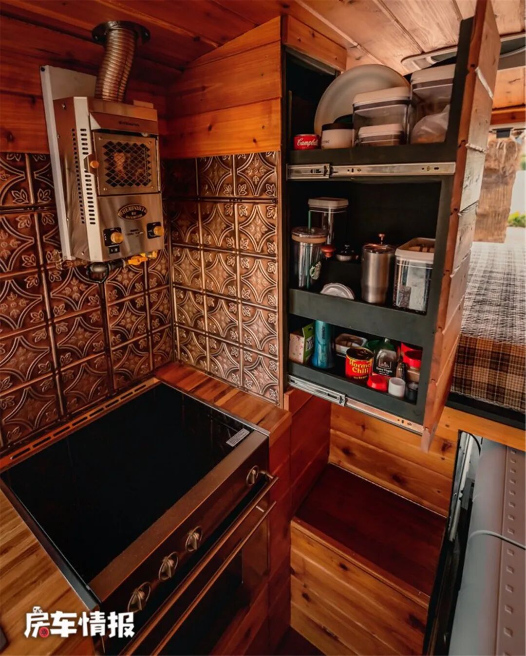 厨房的墙上安装一台丙烷壁挂炉,其烟囱与位于床头和屋顶的风扇和烟雾探测器相连接着,一旦有什么风吹草动,第一时间打开风扇排风,消除了安全隐患。厨房带有多美达95L的冰箱,可以隐藏在床下空间。