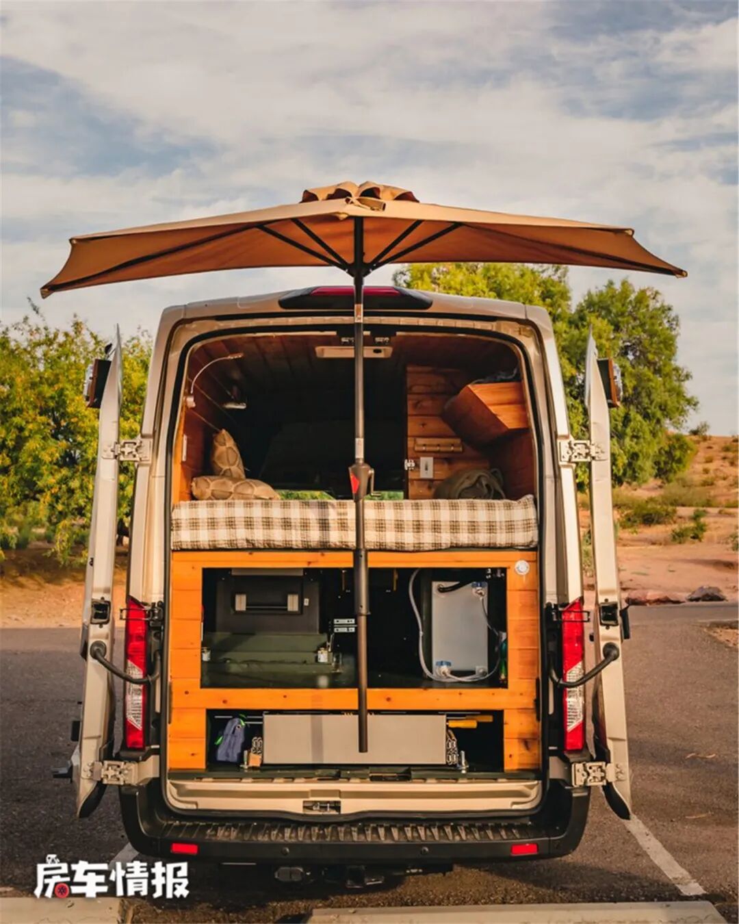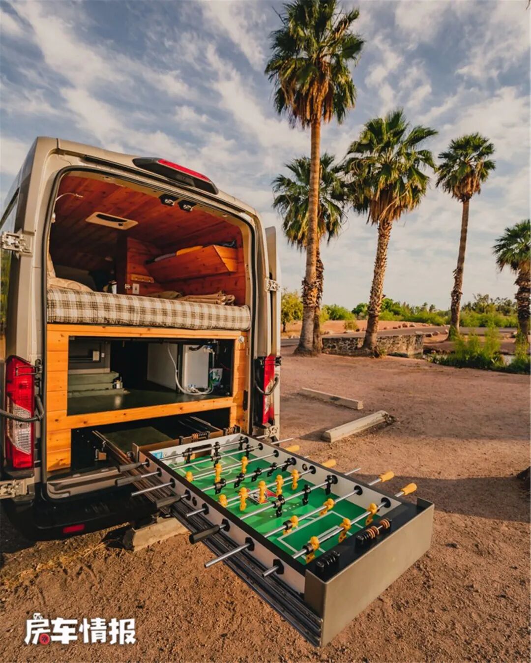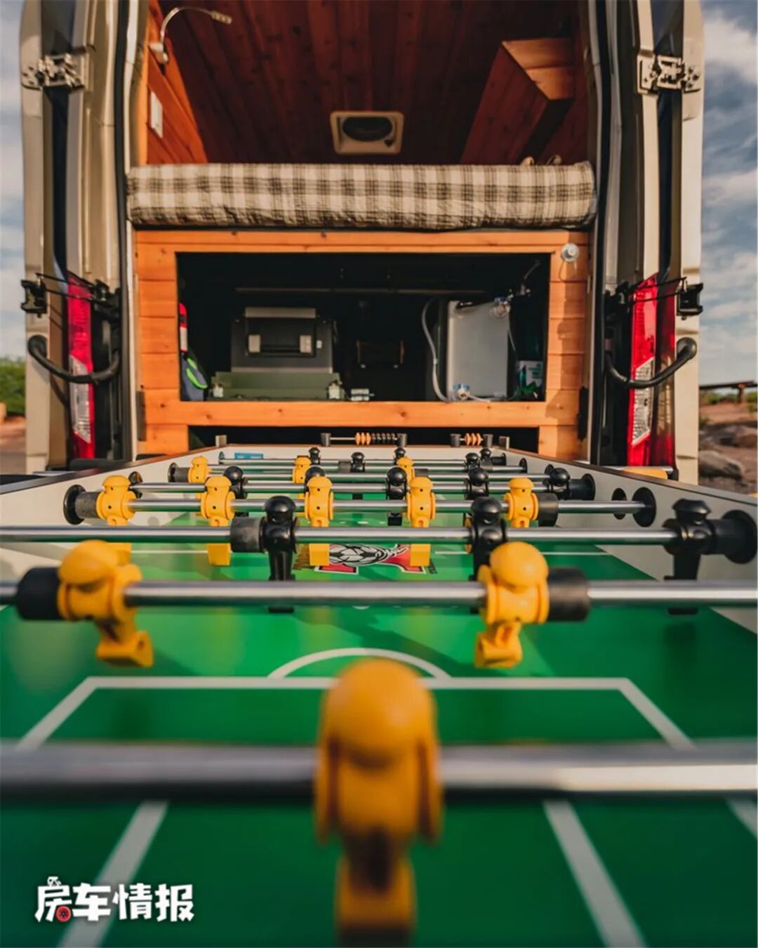 车尾门可以双向打开,床下的储物空间非常大,而且是上下分层,下层设置了一个滑动的桌面足球。拉出来之后,摆上户外桌椅就可以尽情游戏。为了适应各种天气,车尾部还加装了一个大遮阳伞,取代了传统的车侧遮阳棚。