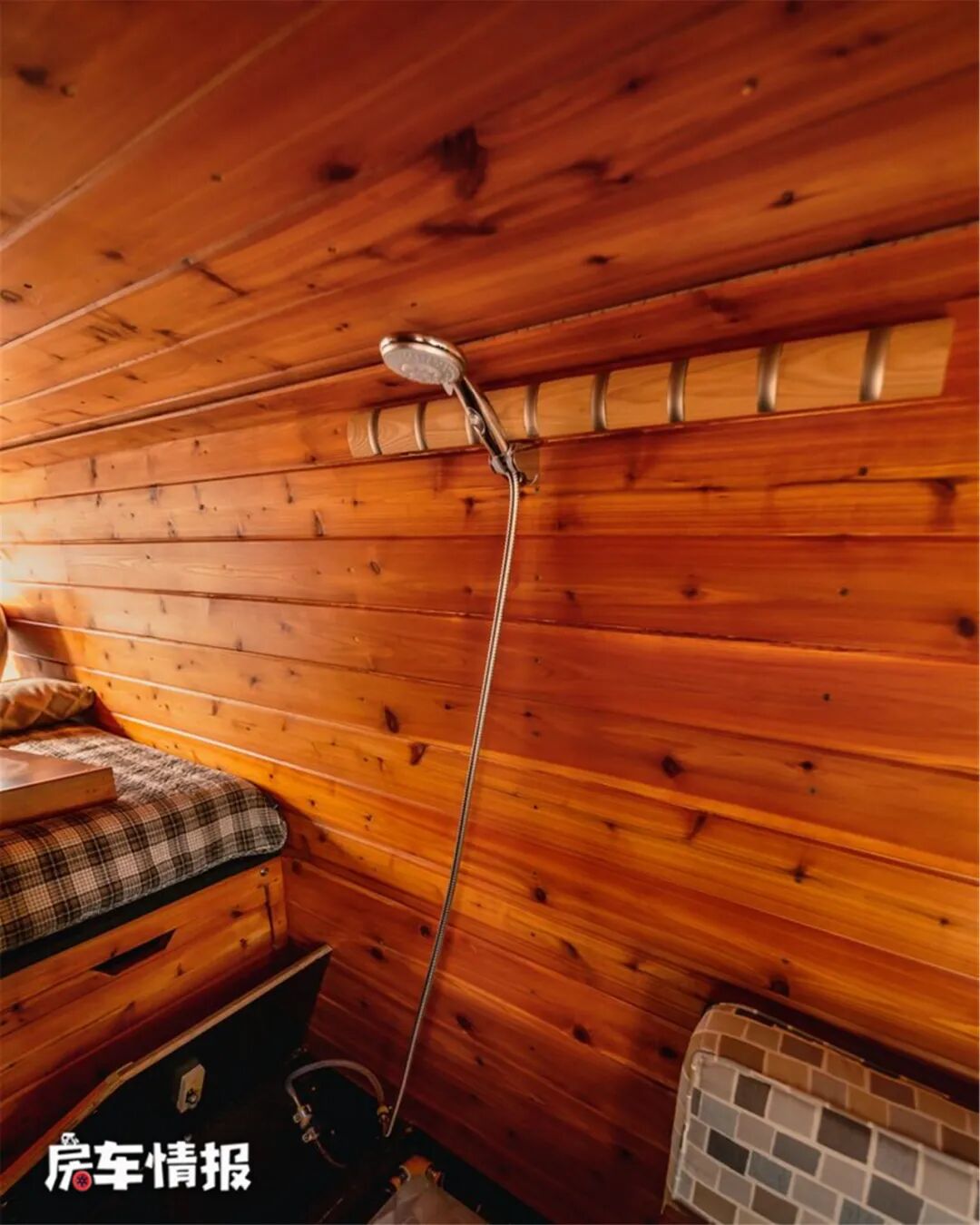 这款房车的卫生间和洗浴间由于车身空间,设计成了可收纳起来的隐藏式结构。打开沙发底座,就可以发现竹制床的可收纳式淋浴盆,卫生间由隐藏式便携马桶。这个像汗蒸房似的临时淋浴区相比固定淋浴区,更加实用,节约额外空间。