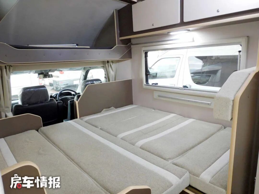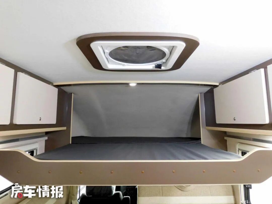 位于驾驶室顶部同样提供了一张额头床,为了提供更大的空间,额头床床板采用抽拉式设计,夜晚休息的时候,可以向外抽出床板,使得额头床面积拓展到1900*1900mm,同样可以满足日常使用。