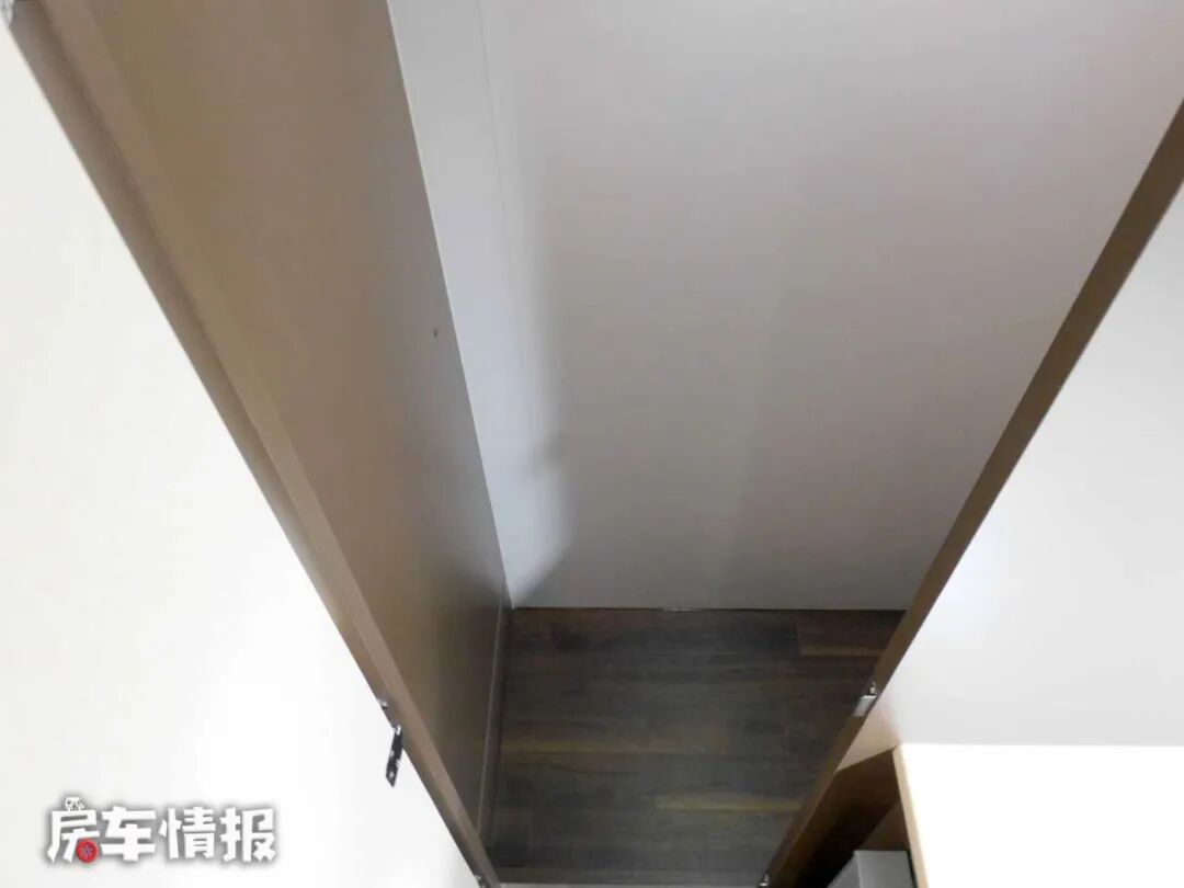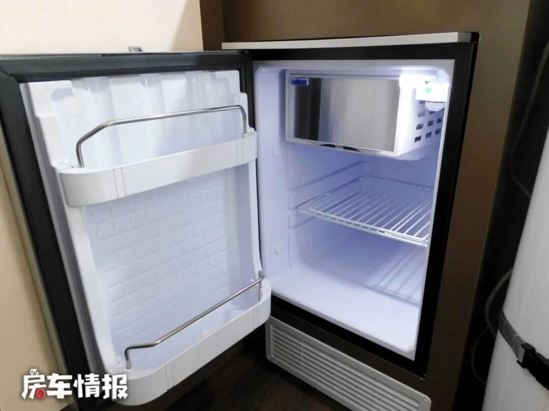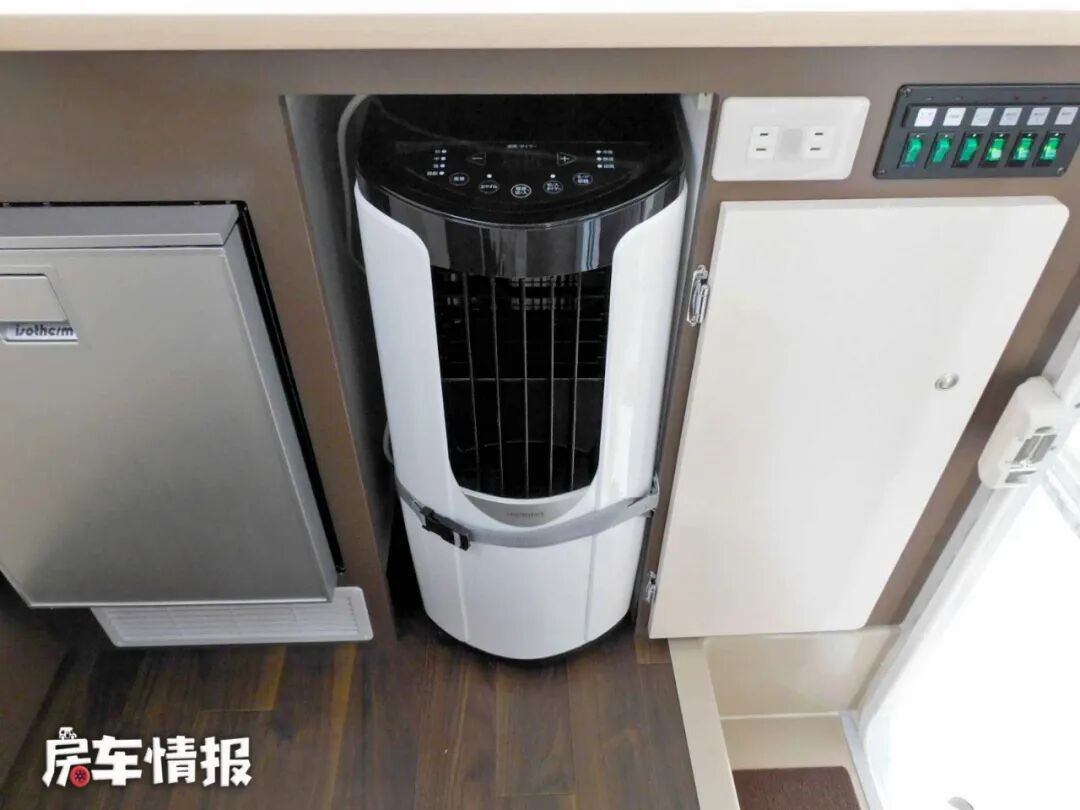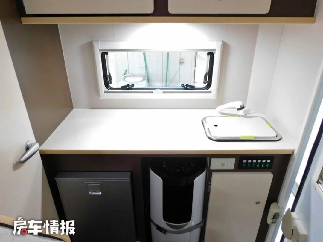 车内的厨卫区域位于车厢尾部,厨房内提供了比较丰富的设施,洗菜池、房车专用冰箱、储物柜等,除此以外还提供了一个房车上比较少见的家用空调扇,这点还是挺新鲜的。