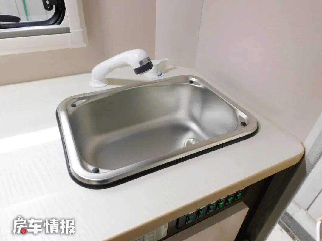 车内的卫生间和大部分日本房车一样,只是一个简单的洗漱区域,内部并没有马桶、淋浴等装置,并且地板也是和车内地板持平,没有任何防水装置。