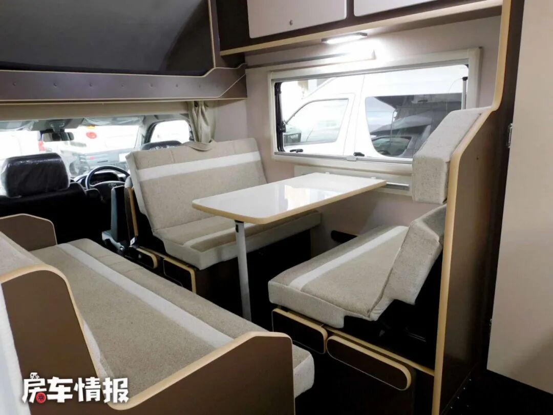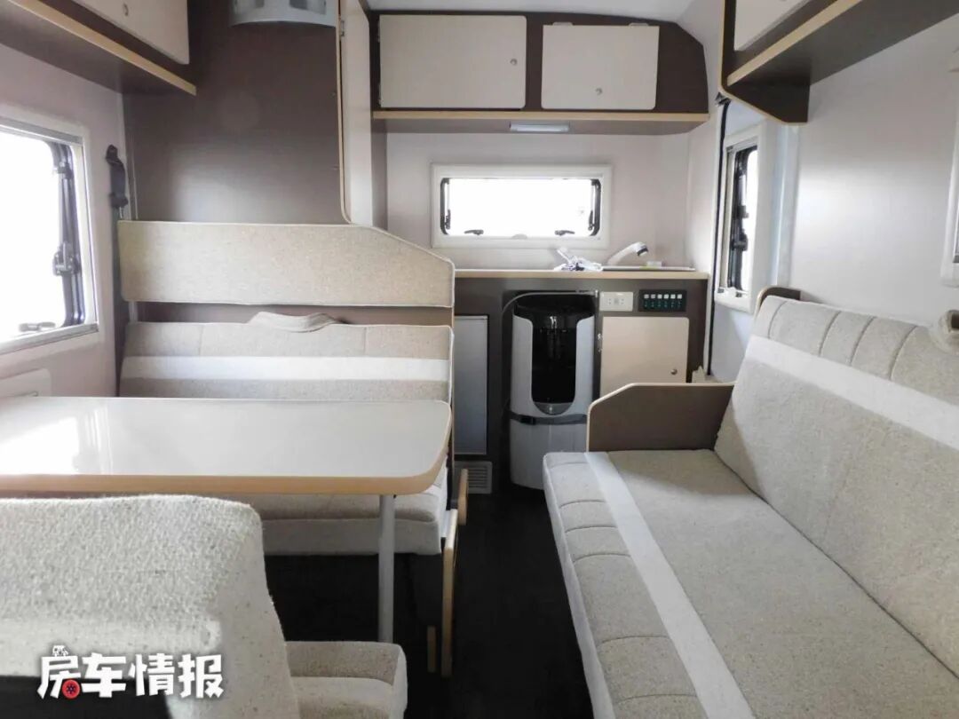 车厢内部生活区的空间不是很大,但整体布局很清晰,对于一家人使用还是绰绰有余的。车厢前方是车内的会客休息区,这里提供了一组条形沙发和四人对卡座沙发,这样的布局和国内的一些单拓展车型比较相似。