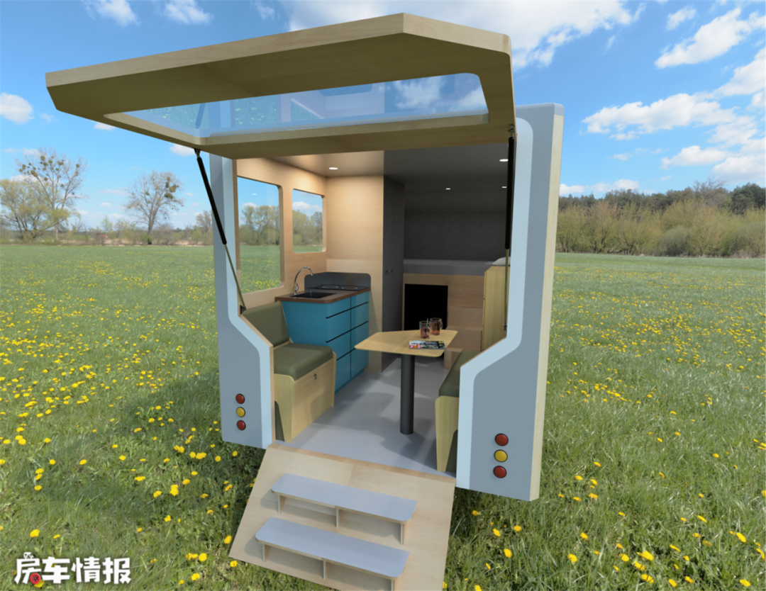 这两款房车都采用后开门设计,乘客门可以向上掀开,两侧有液压杆作为支撑,非常安全。后者的车门下方是双层木台阶,隐藏式踏步的设计,既实用又方便。