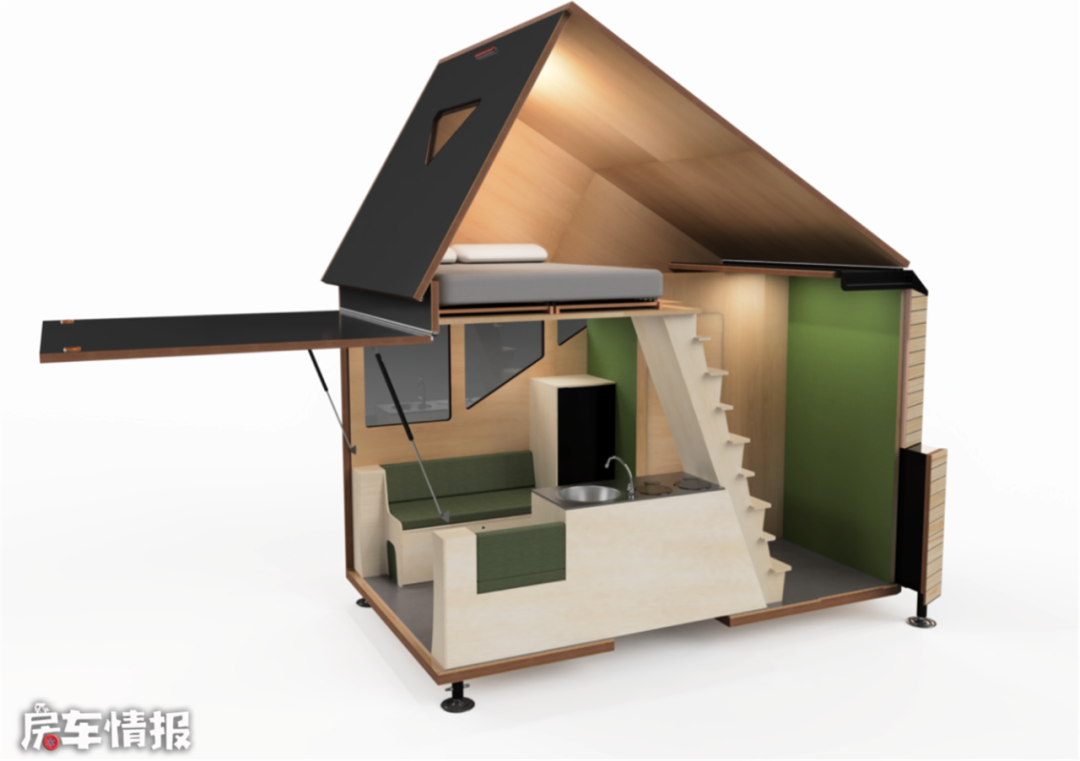 Opperland木屋房车在降下四角支腿后,保持一个水平的车身,然后就可以将已收起来的三角形的屋顶巧妙地弹出来。三角形屋顶既是屋顶,又是乘客门,这个巧妙的设计让我们眼前一亮吧。