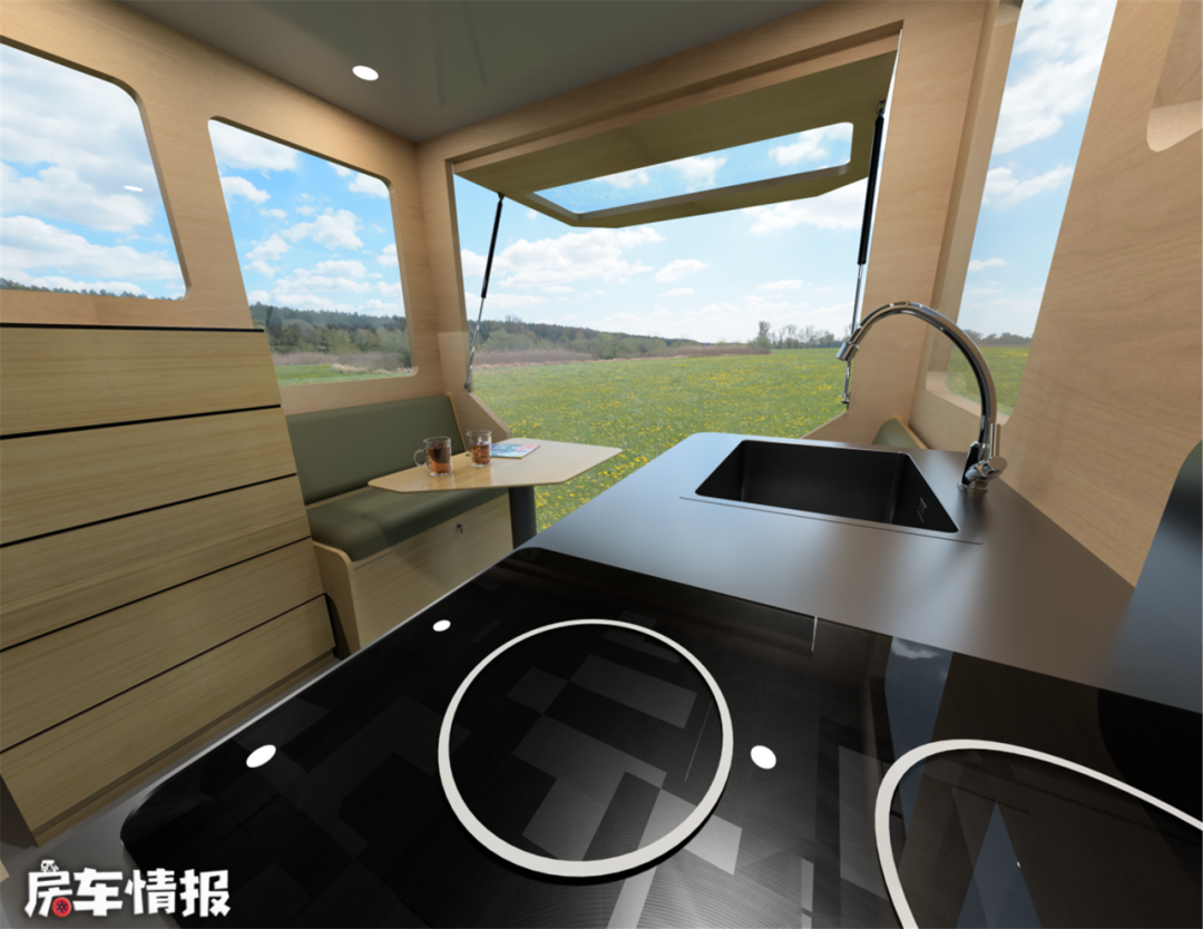 厨房区设置在沙发的旁边,由一个长方形的灶台组成,上面安装了不锈钢水槽+水龙头,旁边是一台感应式电磁炉,由内置的360 AH锂离子电池供电,81L的冰箱安装在了正对面,提供冷藏和冷冻功能。