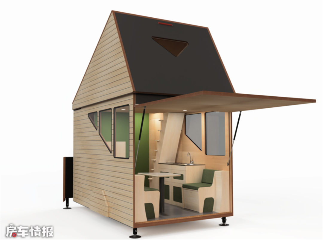 两款房车的装载和使用方式有点不同,Opperland采用了可移动木屋形式,在驻车后,后面的车厢可以打开四个液压支腿,脱离车厢的前车,就可以当成平板货车来载物,如果要拉客人就只能算一个车头。这种车、房车分离的组合方式有点像拖挂房车,不过驾驶拖挂房车需要对驾驶技术熟练,对没怎么拖过车的车主是个考验。而要驾驶这款木屋房车就没了顾虑,因为行车时就又“车房合体”了。