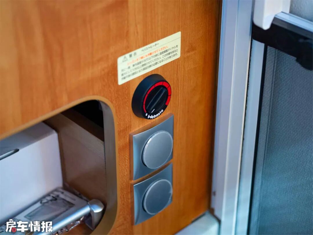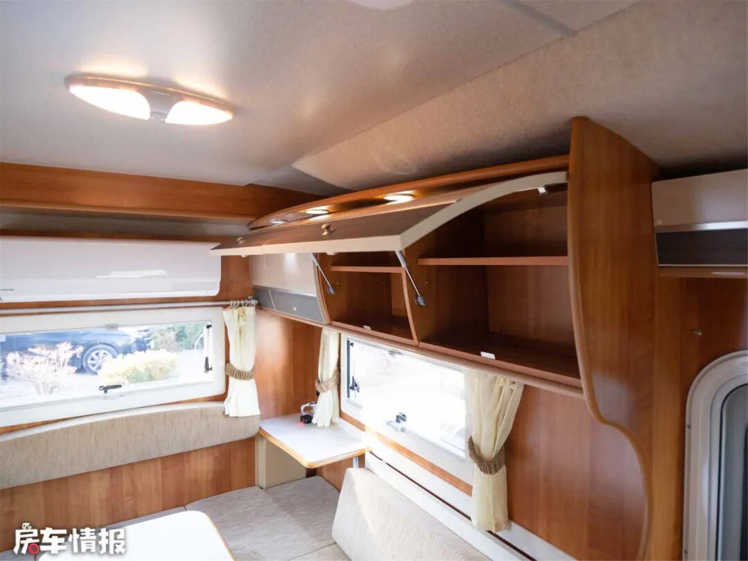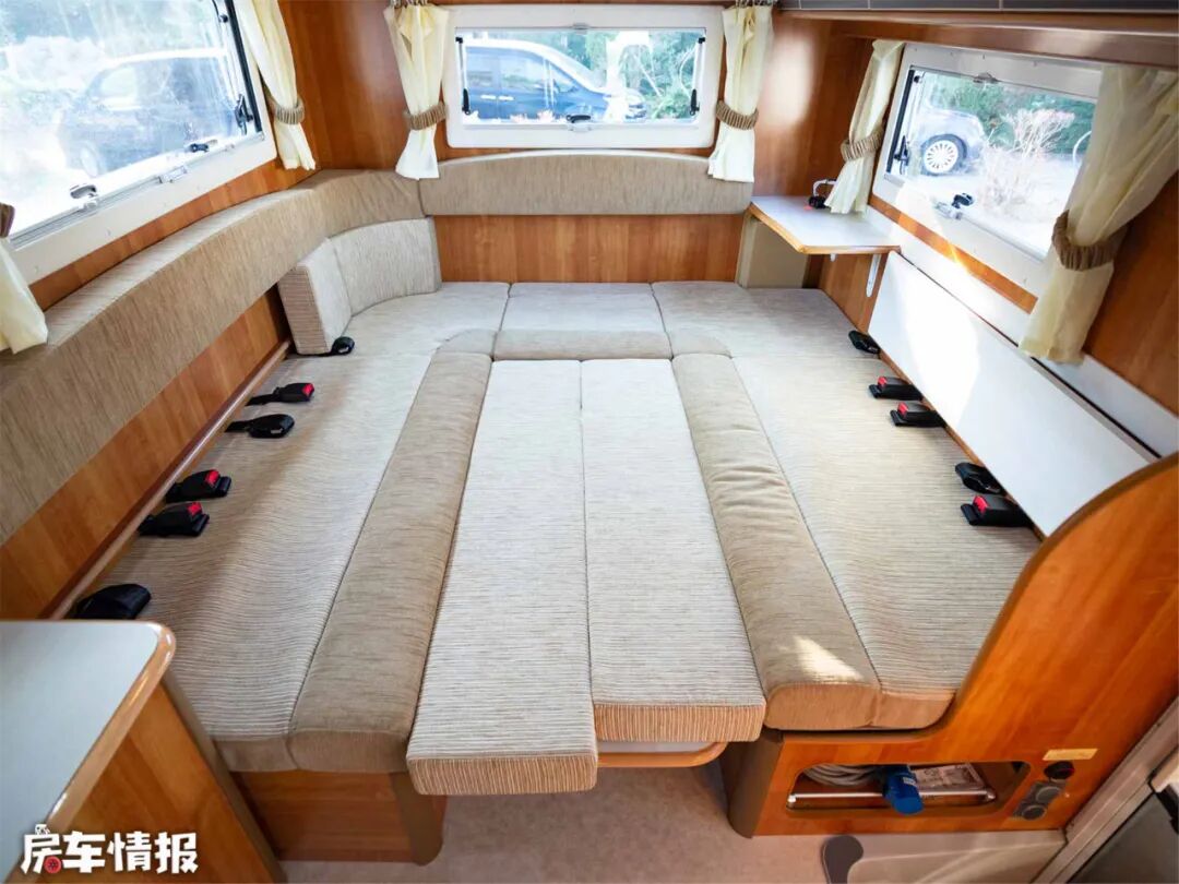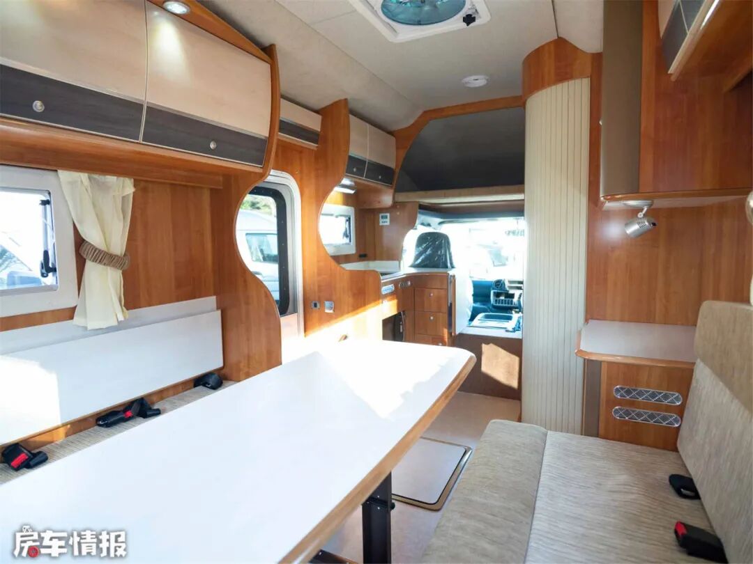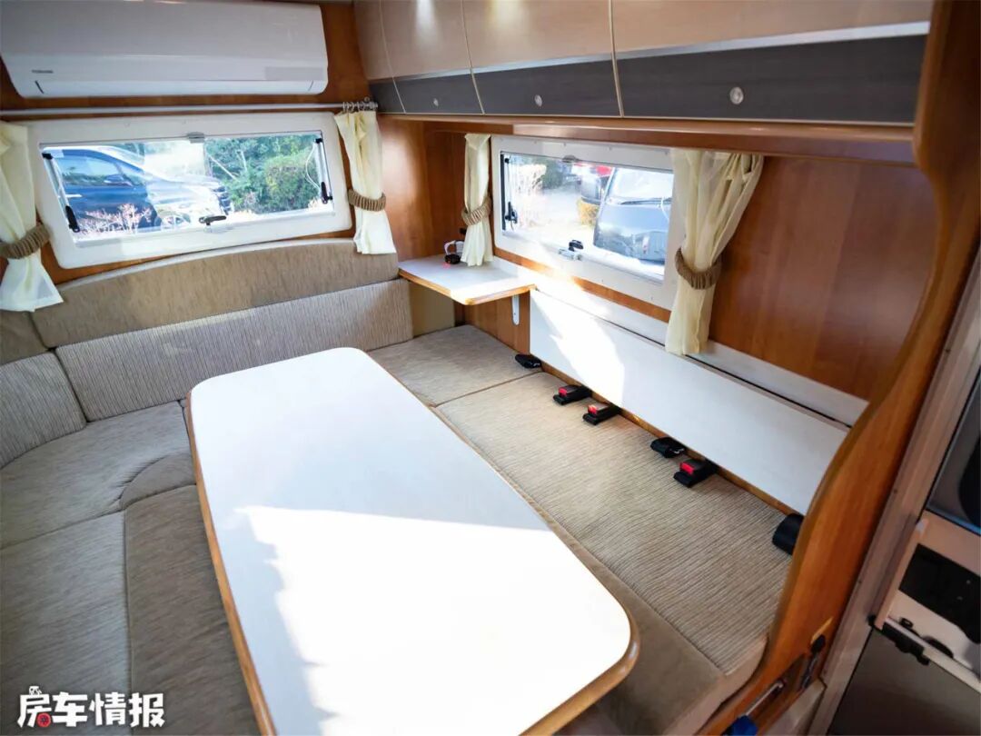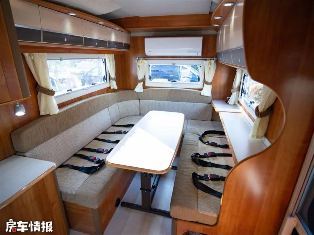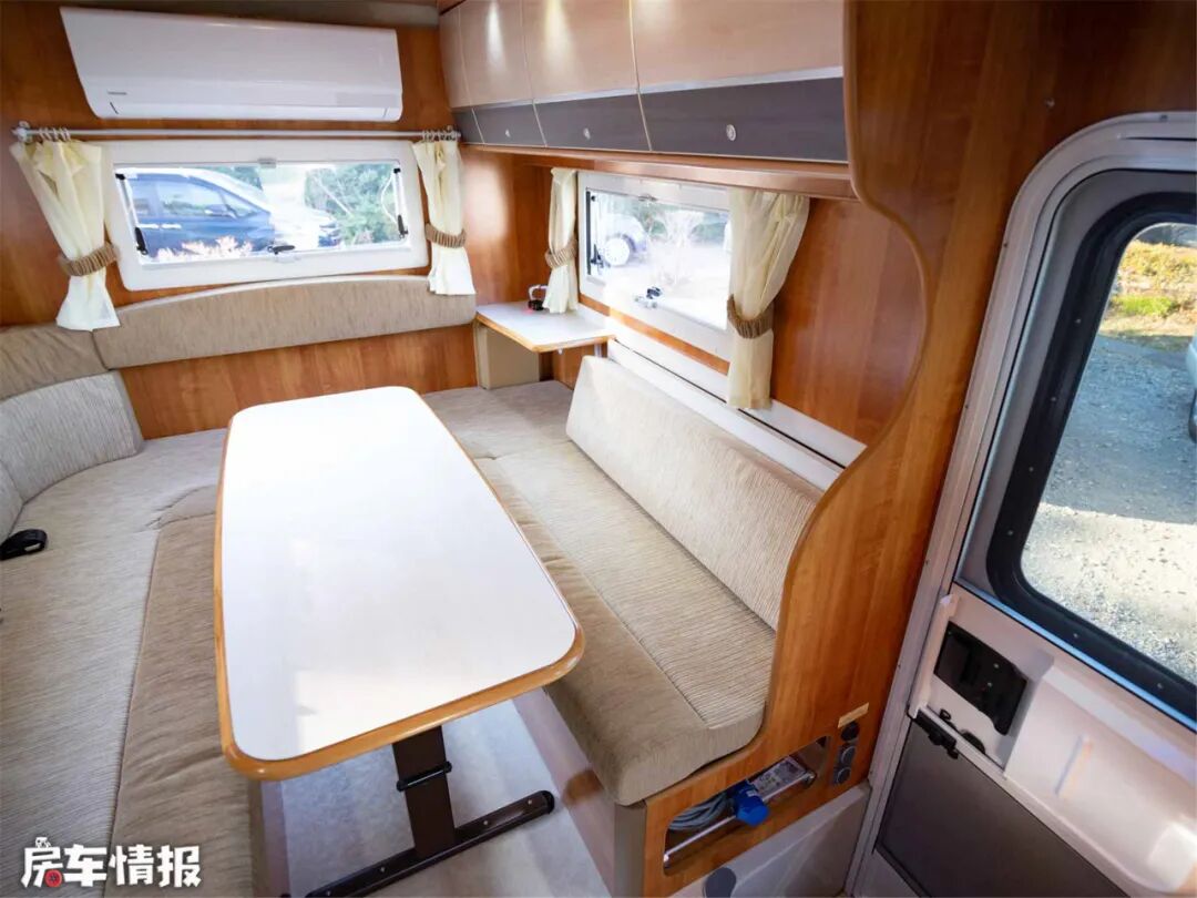 中间的长方形圆角桌是折叠式固定桌,可以降低拼成双人大床,U型卡座三面环窗,通风采光效果爆表。中部的壁挂式空调,冷暖两用,保证合适的室温。除此以外房车还配备了FF燃油加热器,辅助加热,为冬季续航。