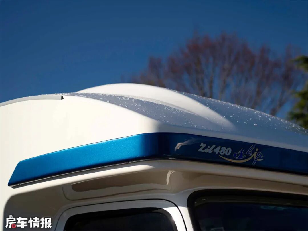 车顶采用侧置导流槽,以防止雨水堆积影响房车行驶安全性。车尾部安装了上下车爬梯,车顶两侧设置有扶手,除了安全考虑以外,还可以当成行李架使用,车内的储物空间一般能满足使用需求的。