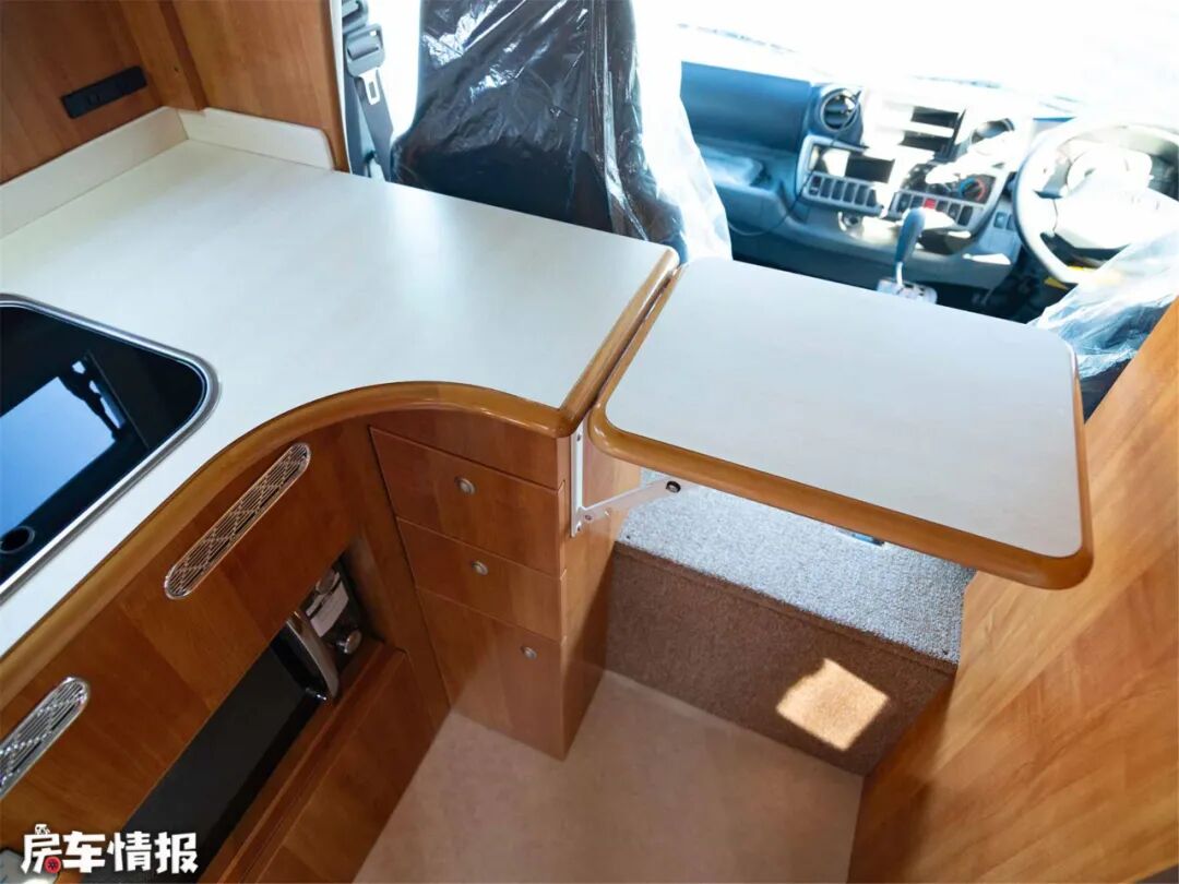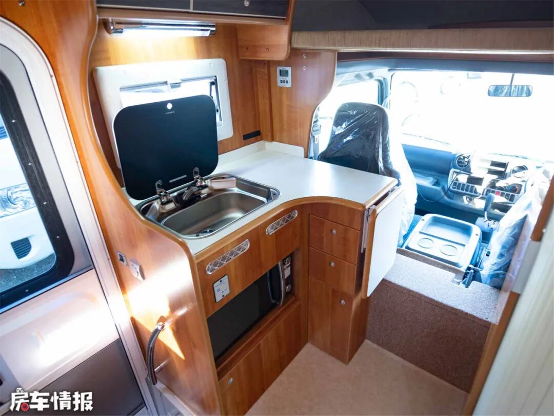 既然“明卫”了,开放式厨房也一定是带窗户的了吧,副驾驶座椅对面就是L型厨房灶台,上方有折叠延长板,打开之后的空间更加宽敞。带盖水槽+隐藏式水龙头+微波炉+顶柜+碗橱,能提供基本的做饭功能,底部提供了一个大点的柜子,可以放置电饭煲、锅具、米、面、粮、油等稍大的东西。