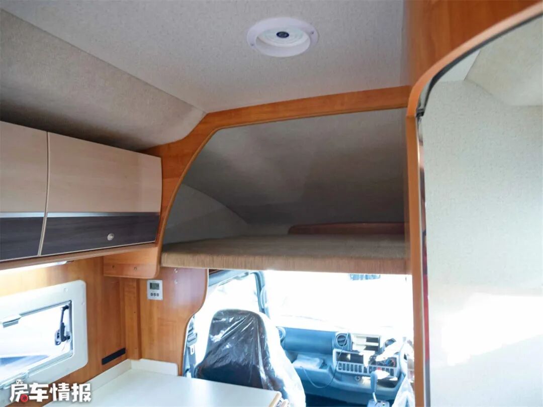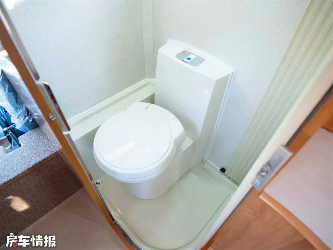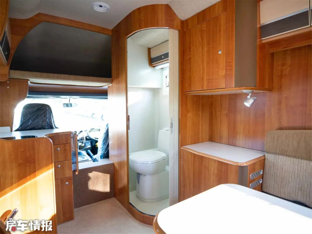 驾驶座后面是独立开门的卫生间,横置卷帘门的设计减小了空间利用,开门时也不用遮挡过道空间。内部装有赛特福德可旋转抽拉马桶,而且是单独水箱,使用前需单独加注马桶用水,和净水水路分离,更加卫生。厕所是明带有侧窗的明卫,上部有小柜子,如果在配上便携式淋浴就更加实用了吧。