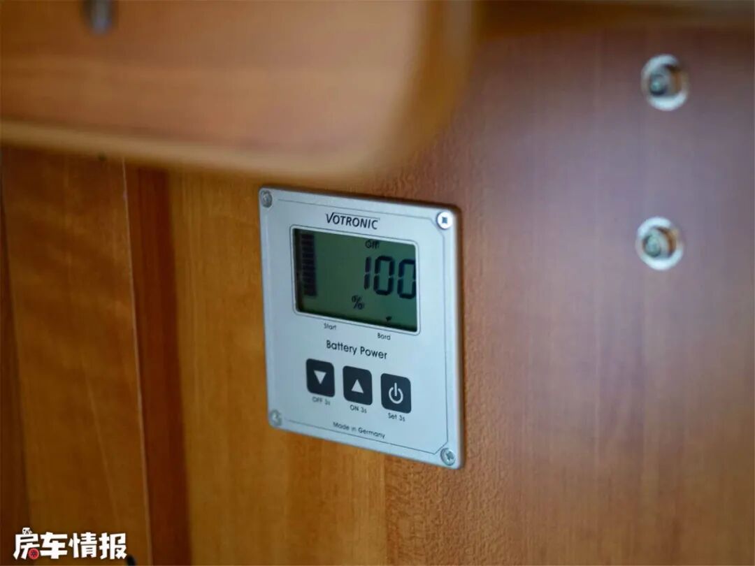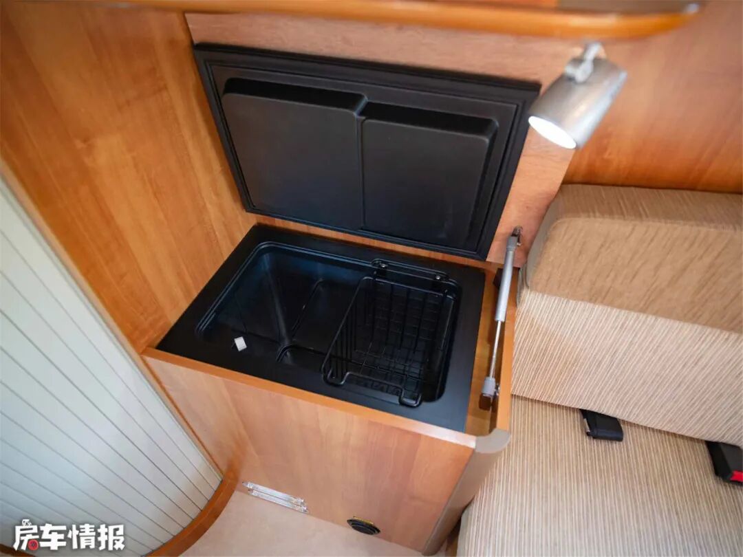 房车采用直流40L冰箱,放置在一进门靠近卡座沙发的位置,方便了房车前、后部分车友共用。冰箱是上掀盖设计,门上有液压杆,在房车行驶过程中能够保证冰箱门不会随意开合。这个设计是不是国内房车值得借鉴呢?