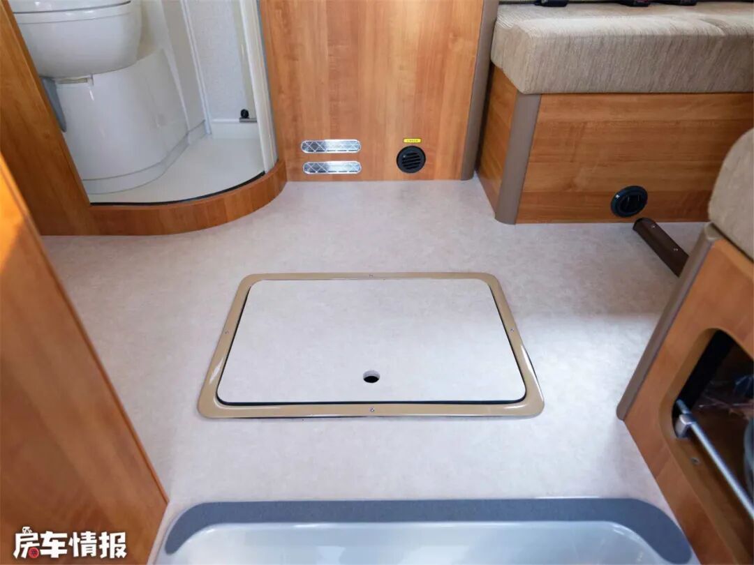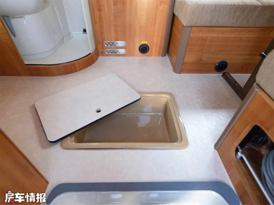 地板上开有底置储物仓,一些随手用的小件物品,随车工具等等可以放置在此处。此外沙发底座里具有较大的空间可以放置被子等较大的行李物品。