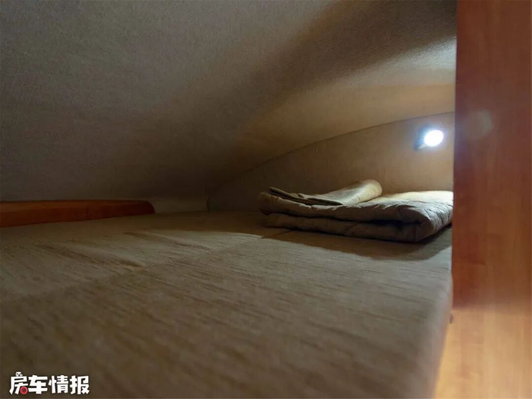 休息区除了U型沙发拼成的双人床,还有额头床,这个空间不带窗户,内部空间也比较有限,充其量也就是能一个大人或者两个小孩子在这儿睡了。两个休息区一共可提供3人床位。