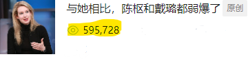 后台显示,截止到目前,本公众号前几天发表的《与她相比,陈枢和戴璐都弱爆了》一文的点击量已经接近60万。