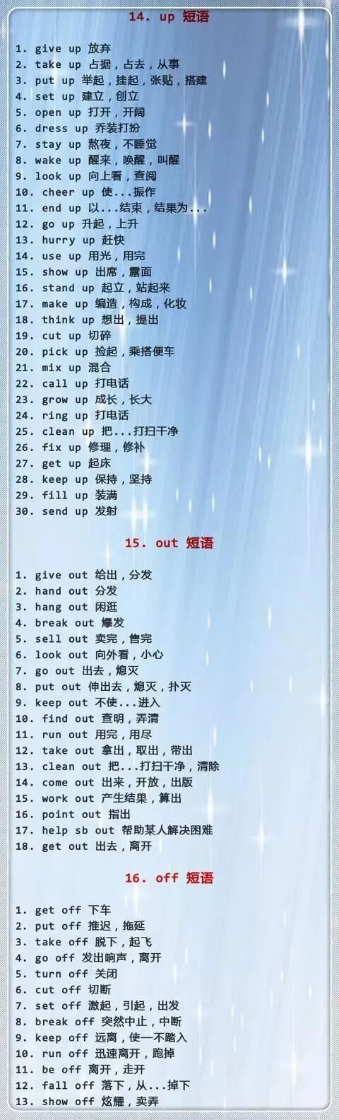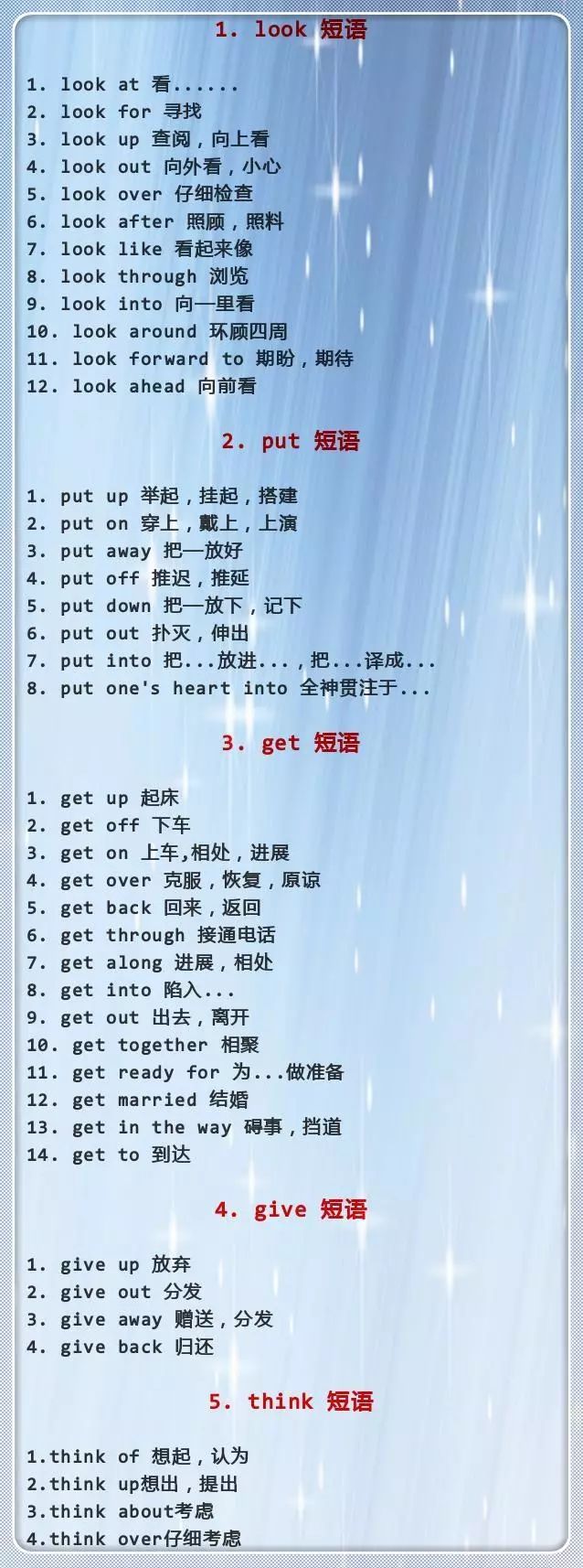 英语作为一门语言,学习的主要方法也是多看多背,多积累,在英语主要有3点:一是单词、二是短语、三是句型,只要掌握好了学英语其实很简单。所以,为了帮助大家学习,下面是专门给大家整理的!