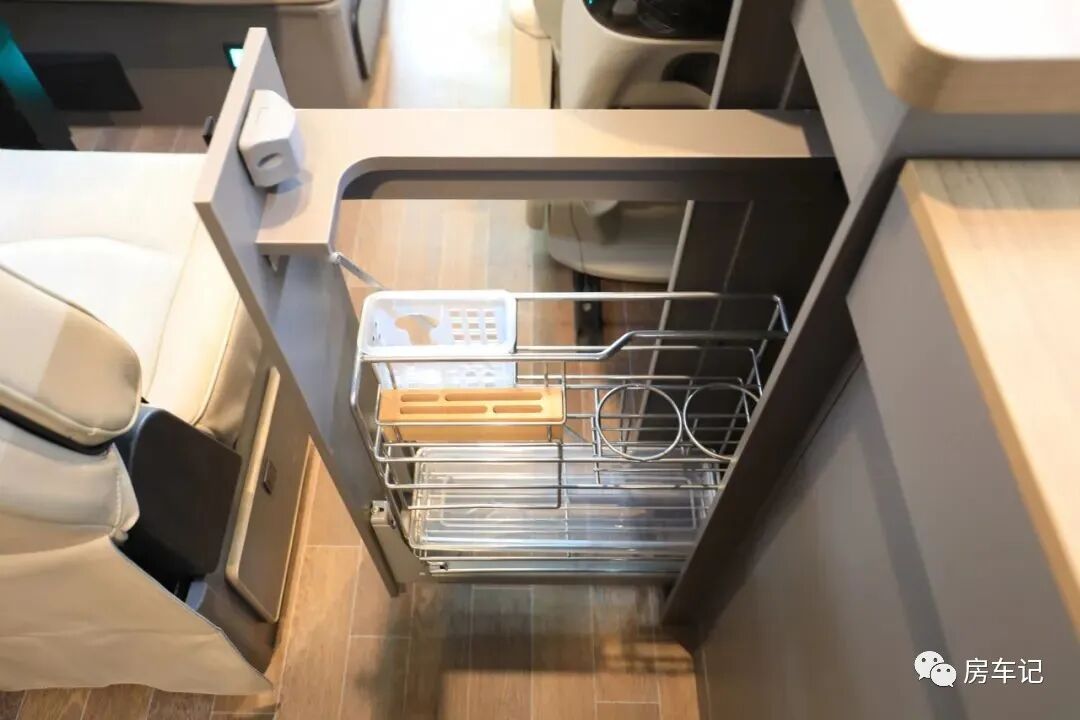 整车设计亮点还有可推拉厨房区,当推开操作台使用面积便扩大一倍,配置也相当丰富,电磁炉、微波炉、油烟机、洗菜池+美式水龙头、96L冰箱、调料架等应有尽有。