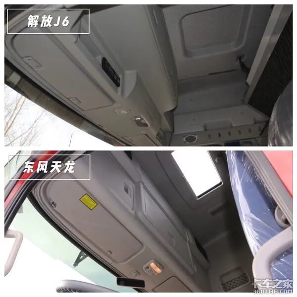 两车均采用了高顶双卧驾驶室,解放J6顶置储物柜采用了上下两层设计,上层为封闭式储物柜,下层在主、副驾区域设计了两个开放式储物格;东风天龙则是采用了三个大储物柜的设计,两边储物柜采用左右开启方式,在两侧,还设计了小网兜,可方便二层卧铺驾乘人员用来储放物品。储物柜的上方设立了两个音响喇叭,并且车顶上设计了天窗,能够明显为驾驶室补充光线。
