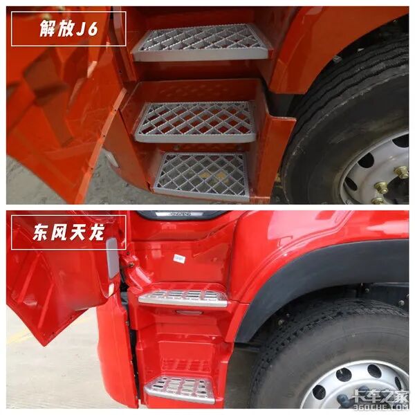 两车都是采用凸地板驾驶室,相比平地板驾驶室而言,凸地板驾驶室的装配高度较低,这样使得驾驶室入口整体都要下降不少,为了驾驶员登车的便利性,解放J6采用的是小跨步三台阶的设计,铝合金镂空踏板在实用性和耐脏程度都有着不错的效果。